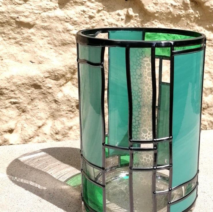 This stained-glass effect flower vase was inspired by pieces of sea glass found washed up on the shore. I have tried to replicate the colours, blending soft, gentle greens with a darker colour and a bubble effect with a soothing wave design.