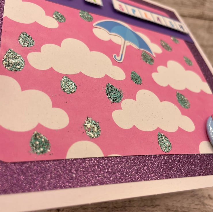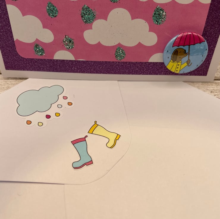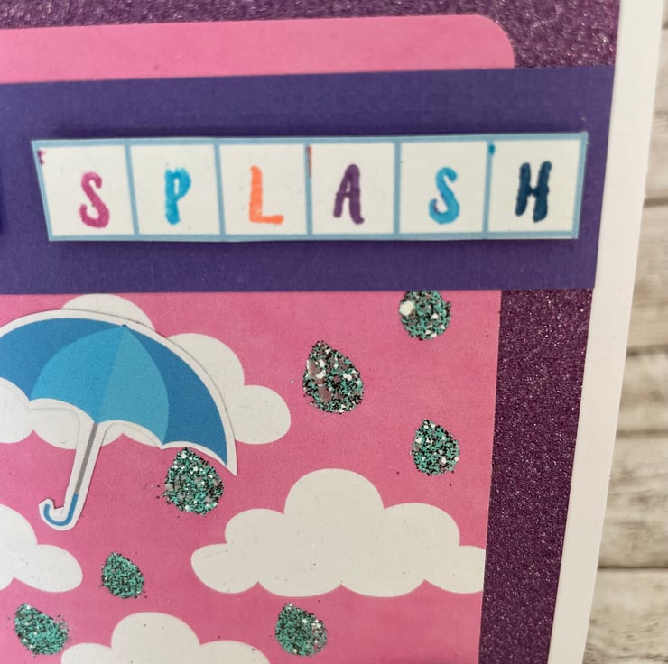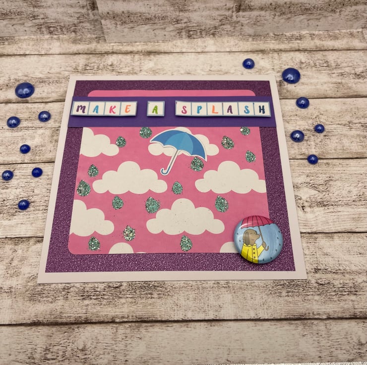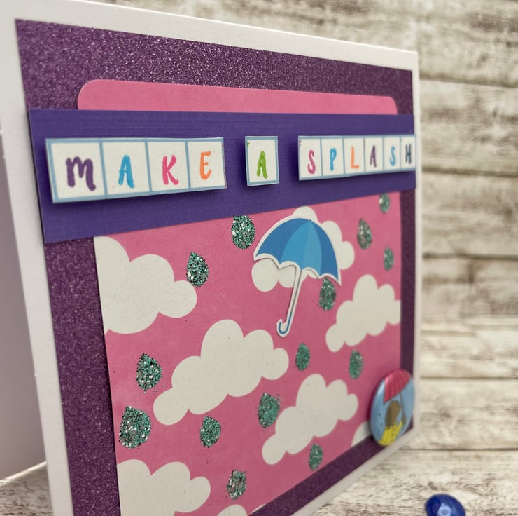 I had a cute dog image with an umbrella as a button and decided to give him some sparkly rain drops. The background printed paper is pink with little white clouds, I stencilled some raindrops on and embossed them with a sparkly effect to add some shimmer and detail. This is mounted on sparkly lilac paper to frame the design. The sentiment "Make a splash " is stamped in various colours and to stand out fixed with foam pads underneath. I added a cut out blue umbrella blowing in the wind. A cute unique card with lots of handmade details for many occasions from kids birthday, new job, general birthdays or just a note for someone special. Comes with white envelope decorated on the back with some wellies and a raincloud sticker. Size 14cm square. Blank inside for own message. Posted in strong card envelope to ensure safe transit. Postage on additional items is free, so have a look around the my shop.