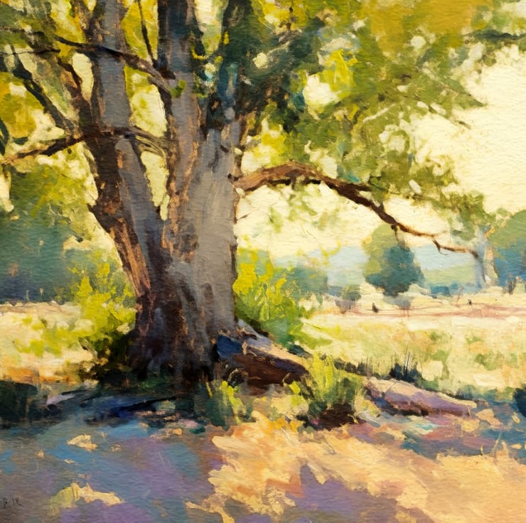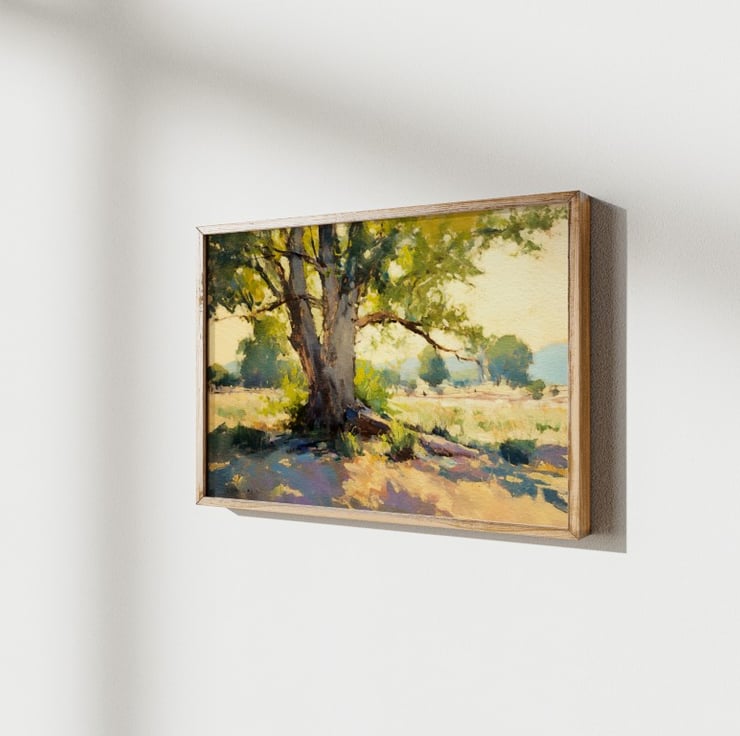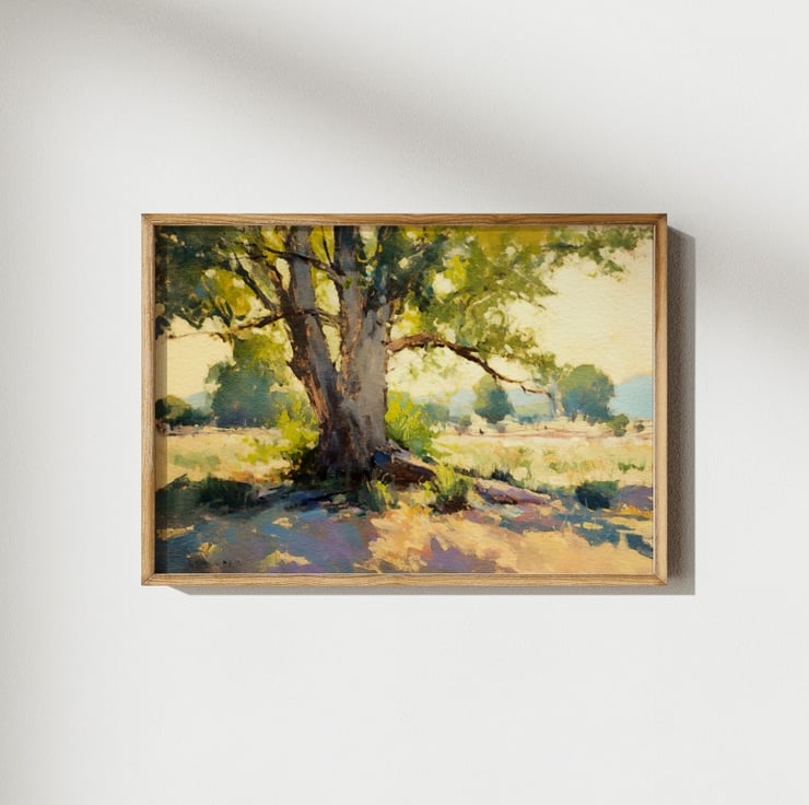 This serene landscape painting features a majestic countryside tree, basking in the warm glow of sunlight. The artist’s masterful brushstrokes bring the scene to life, with vibrant greens and golden yellows blending harmoniously to create an atmosphere of peace and relaxation. The play of light and shadow beneath the tree offers depth and texture, inviting viewers to imagine the gentle rustling of leaves and the soothing warmth of the sun.