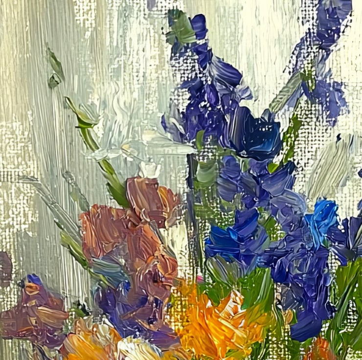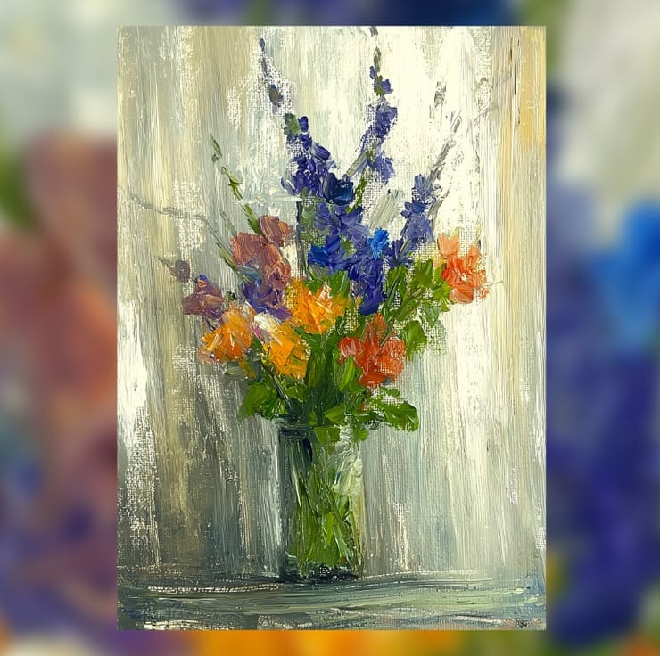 This delightful painting captures the charm of a vibrant flower bouquet, brought to life with textured brushstrokes. A mix of bold, lively colors—orange, purple, and blue—create a harmonious composition, with each petal and leaf radiating energy and freshness. The detailed impasto technique gives the flowers depth and dimension, making the painting feel almost tangible.