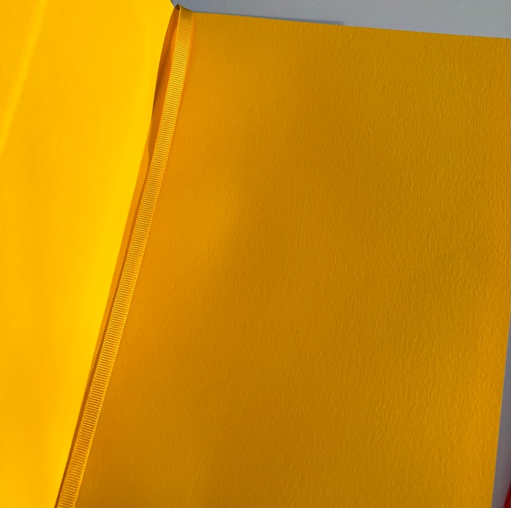 Each book I make includes a ribbon bookmark and coloured end-papers made from high quality Canford or Canson paper, hand picked to match one of the colours in the fabric design. This book has a stunning bright yellow grosgrain ribbon and matching Canford 'Buttercup' end papers.
