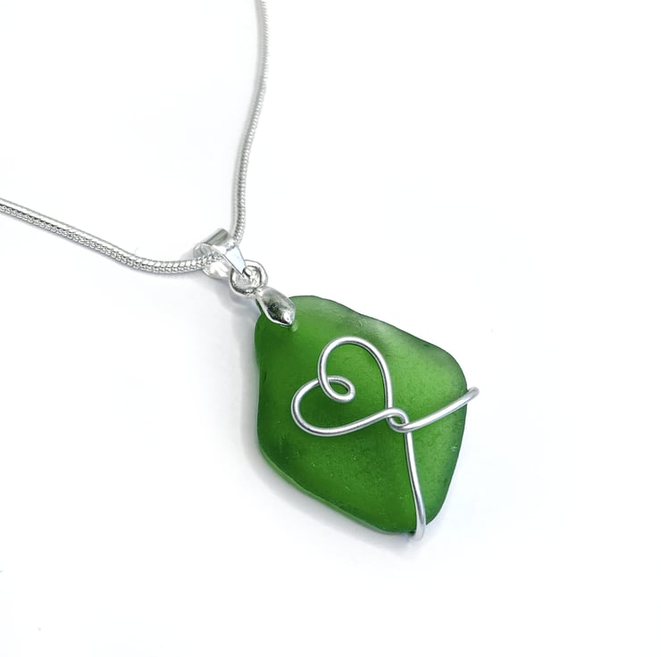 Sea Glass Pendant - Emerald Green Heart Wire Wrapped Necklace - Scottish Silver Jewellery