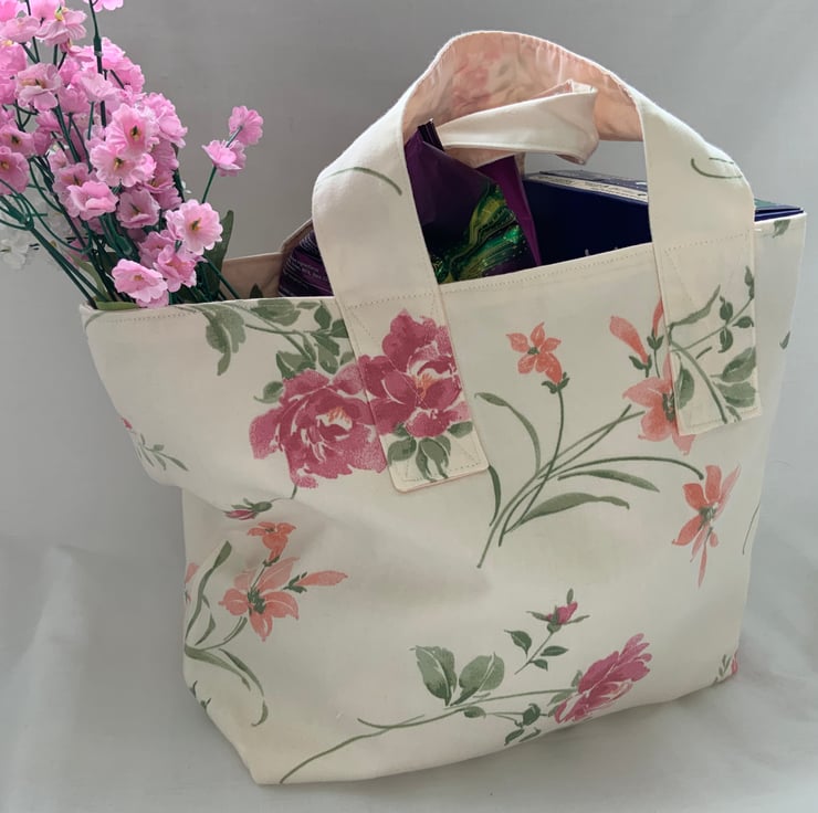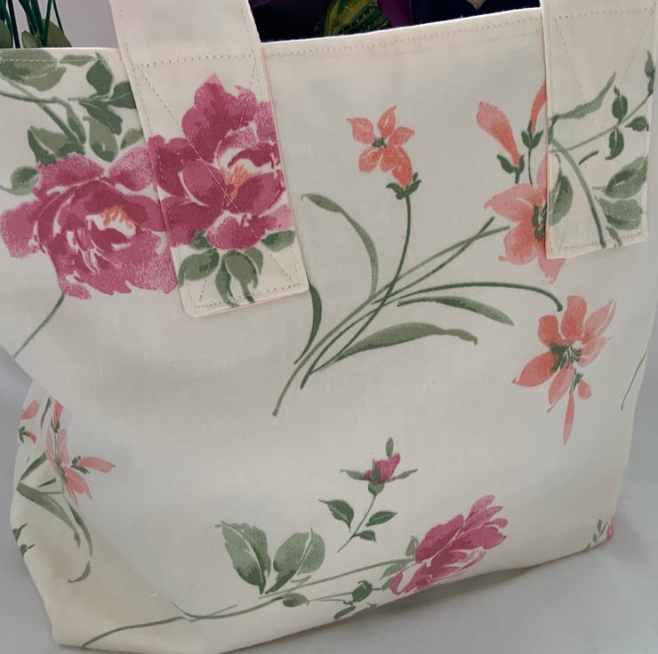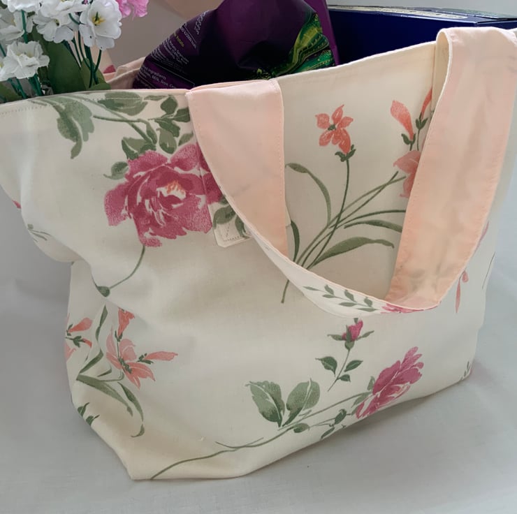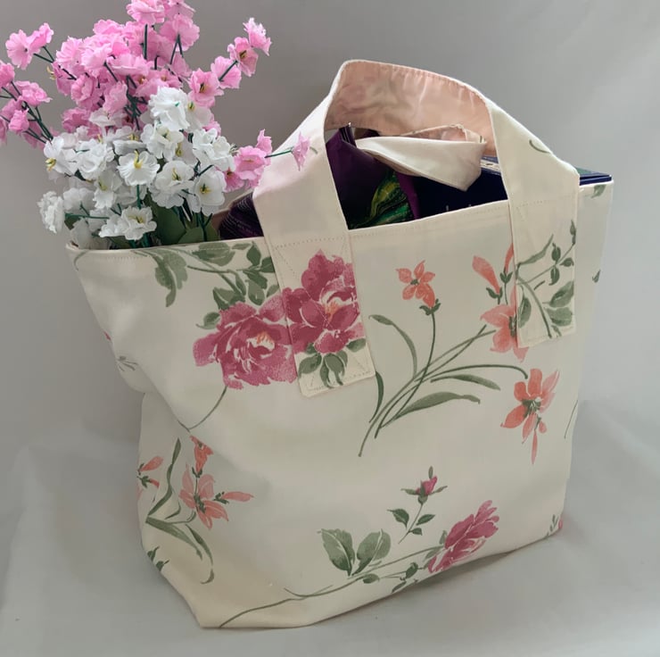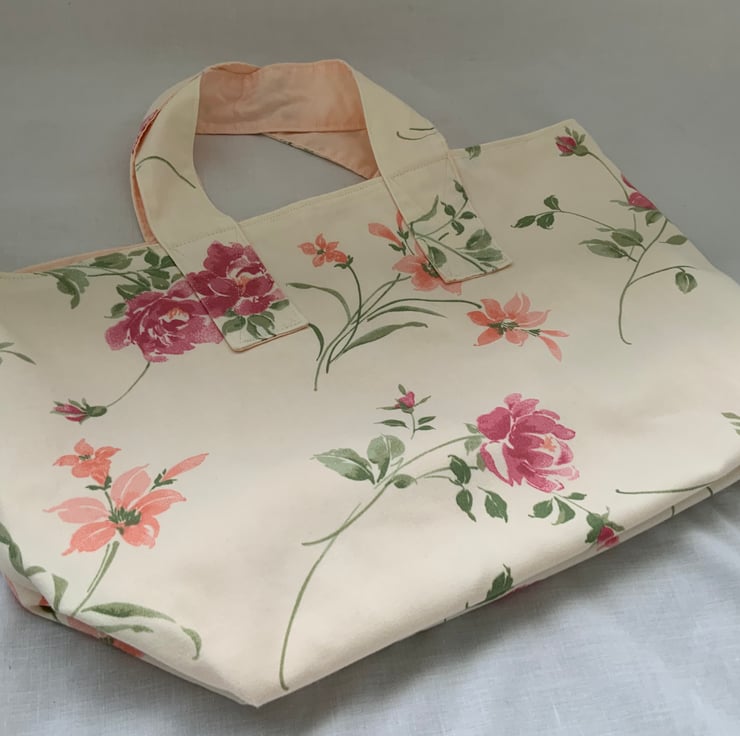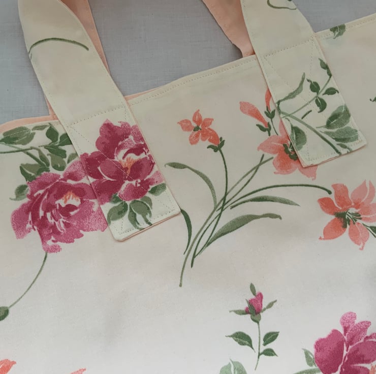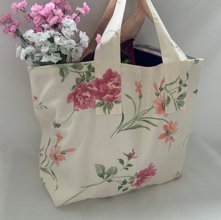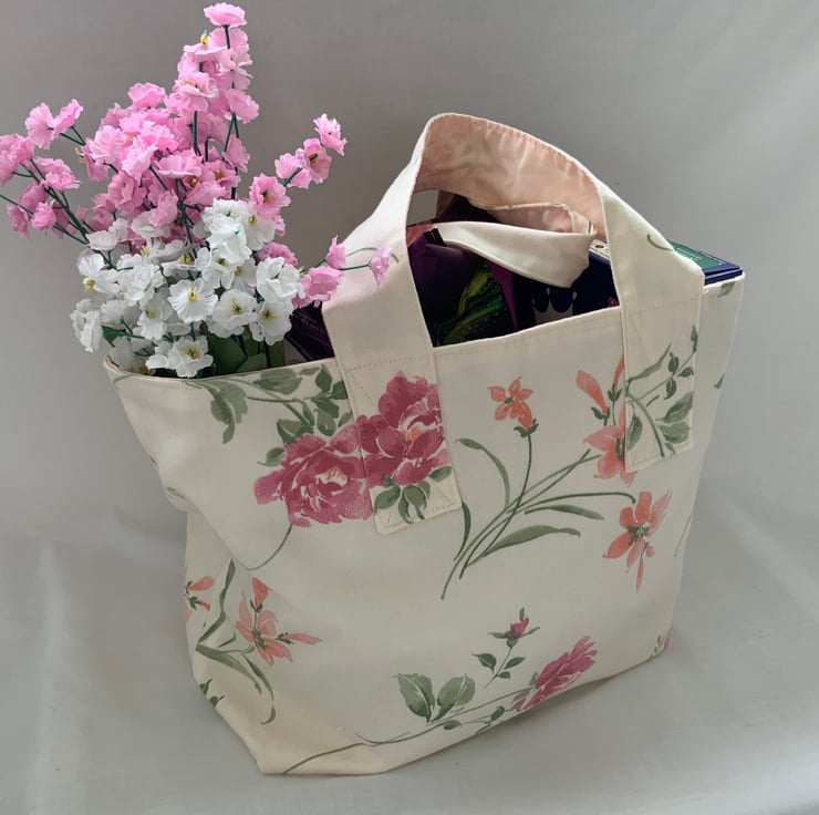 Made from recycled floral fabric and fully lined in cream cotton, it features sturdy stitching on the handles making it perfect for carrying groceries or other personal items.