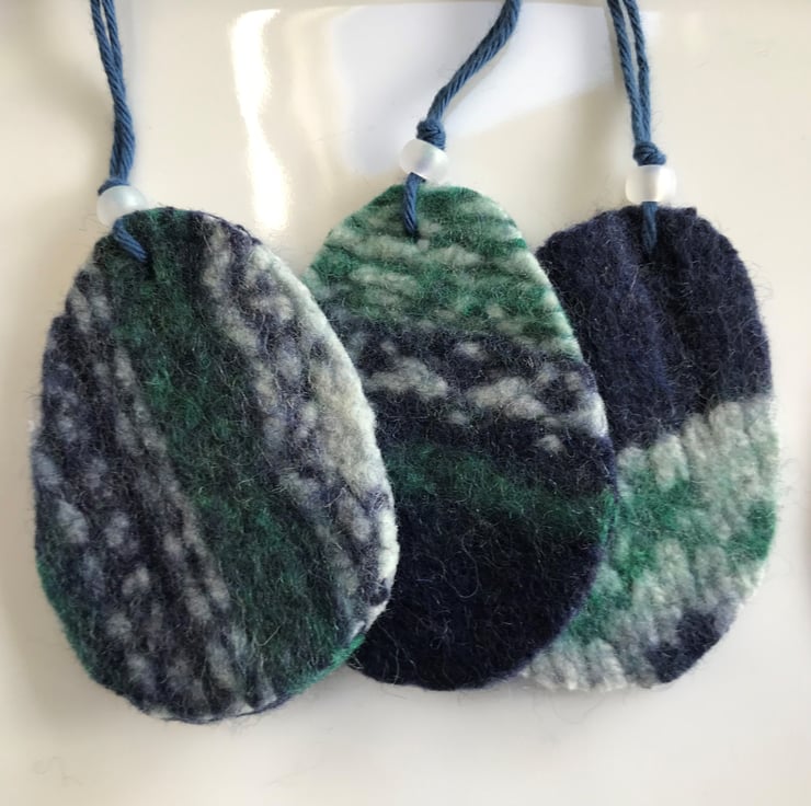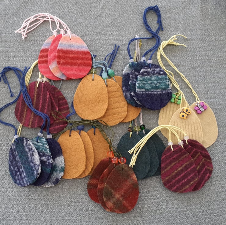 Four unique hanging Easter decorations made from an upcycled jumper with a glass bead