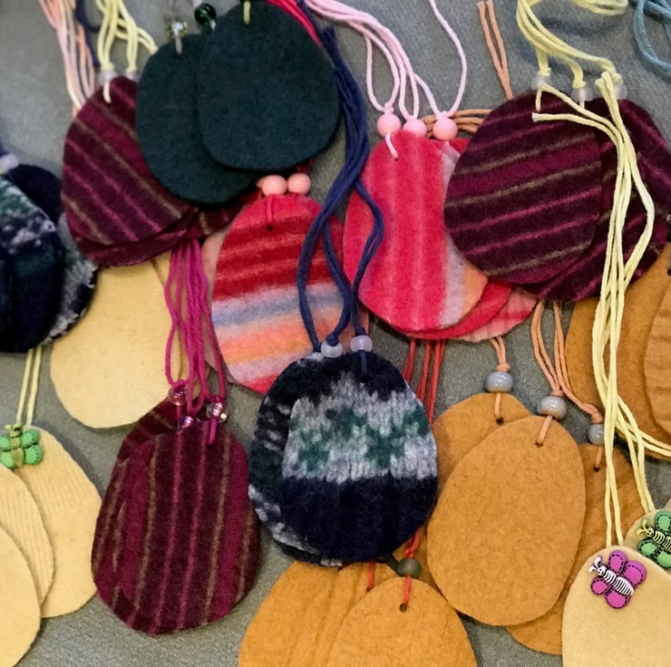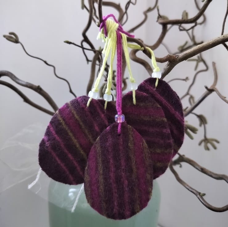 Five unique hanging Easter decorations made from an upcycled jumper with a glass bead