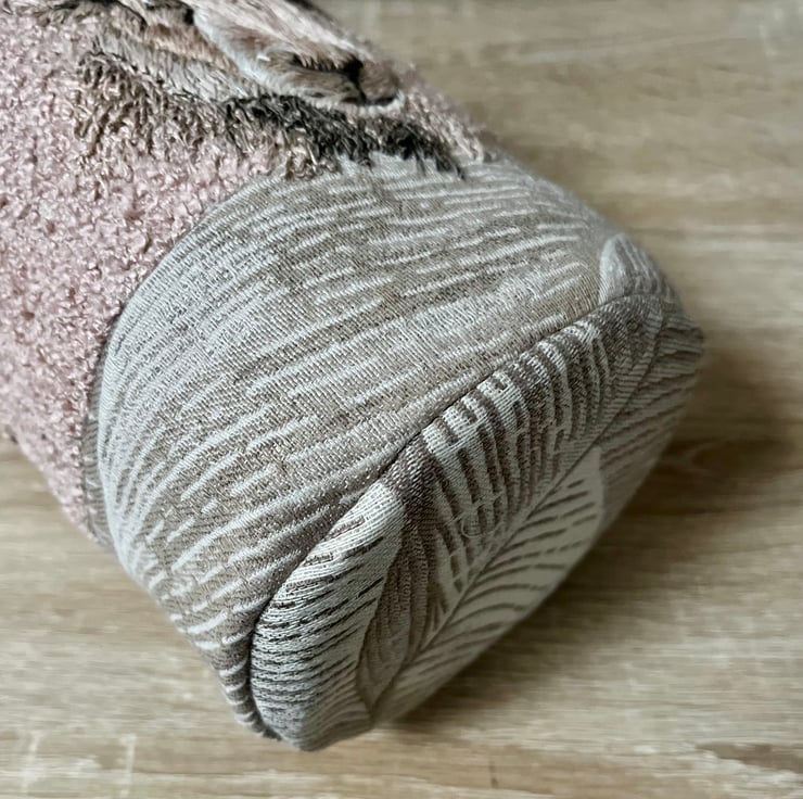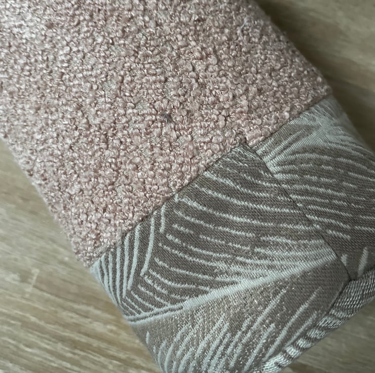 This particular storage pot is made from upcycled curtain samples of a boucle pink textile and a taupe patterned fabric which made me think of rolling fields.