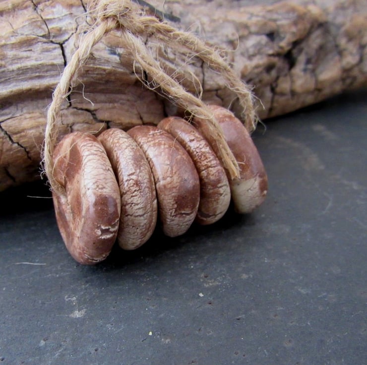 A mixture of handrolled ceramic beads, coloured with dark brown slip and finished with a pearly satin glaze.