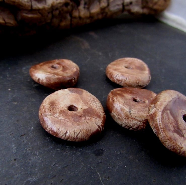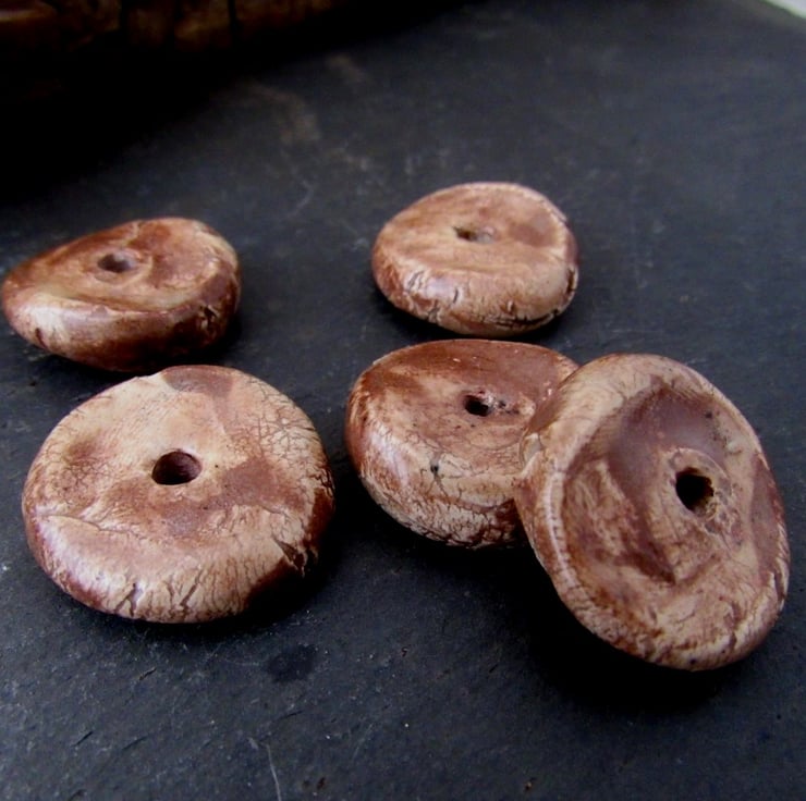 5 Medium Dark Brown Glazed Chubby Disc Clay Beads