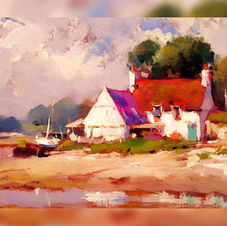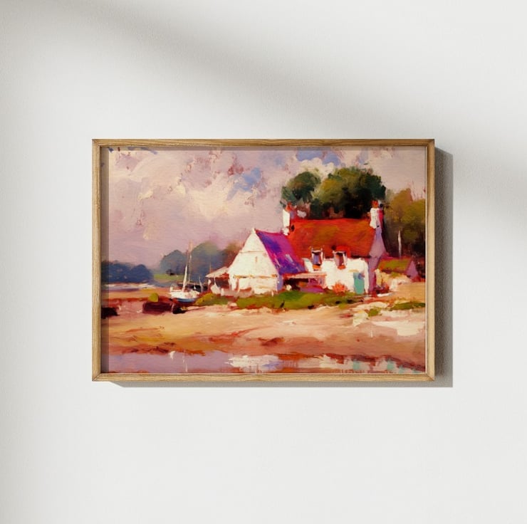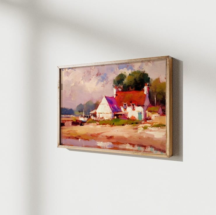 his painting shows a cozy coastal cottage surrounded by peaceful scenery.
