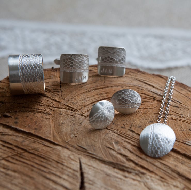 The oval earrings are made from the finest recycled silver and every lace pattern is imprinted individually using real lace and given a satin finish. Using this handmade technique gives this sustainably made wedding jewellery its own unique design.