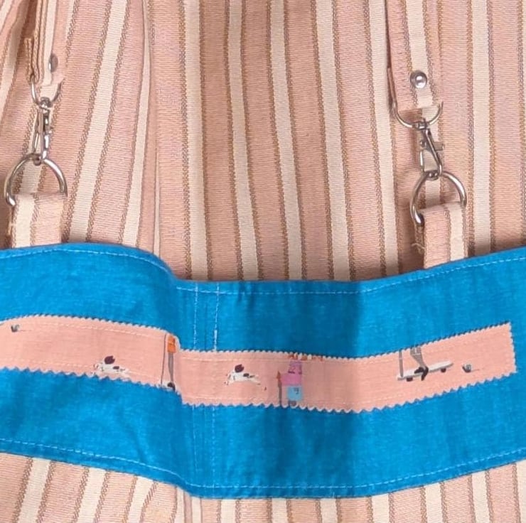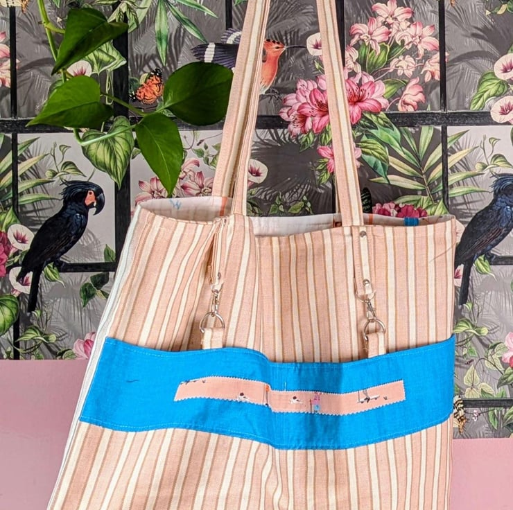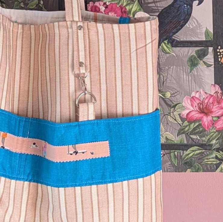 This uniquie one of a kind tote bag I used PiPs layer cake fabric to make this tote.