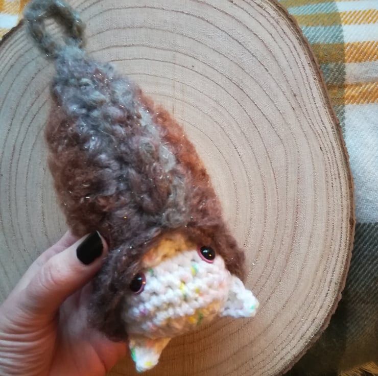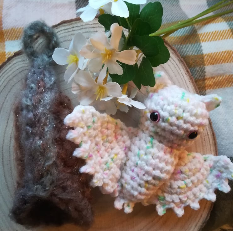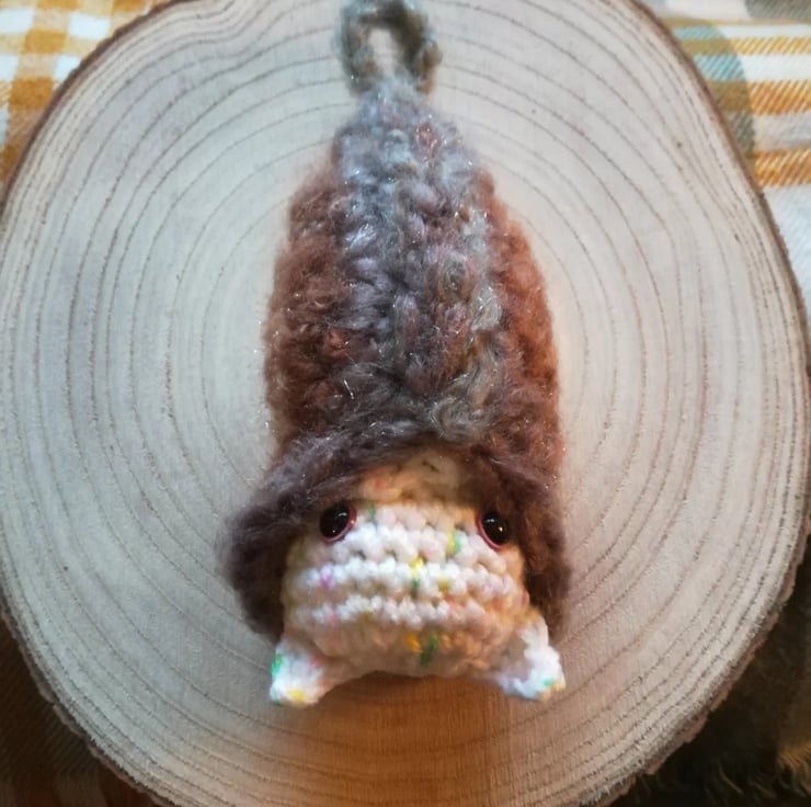 This little crochet bat is made using a lovely mottled yarn with flecks of pastel colours.