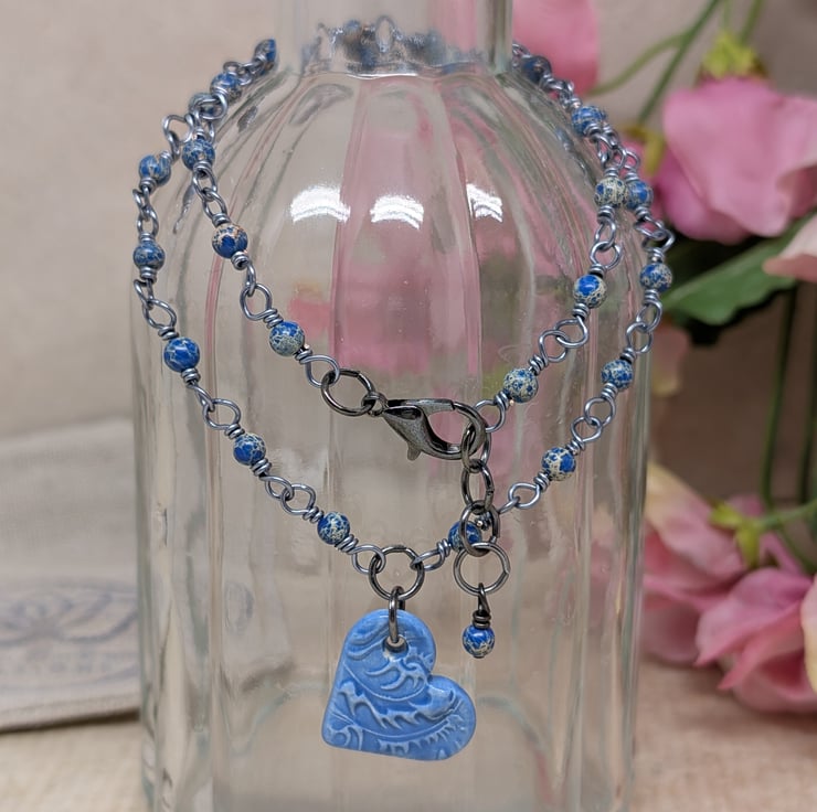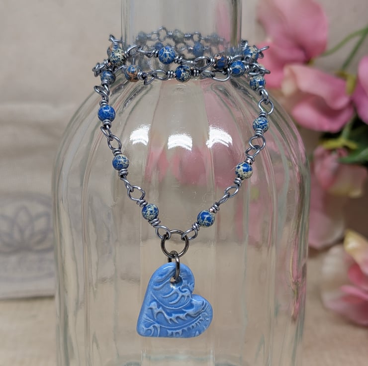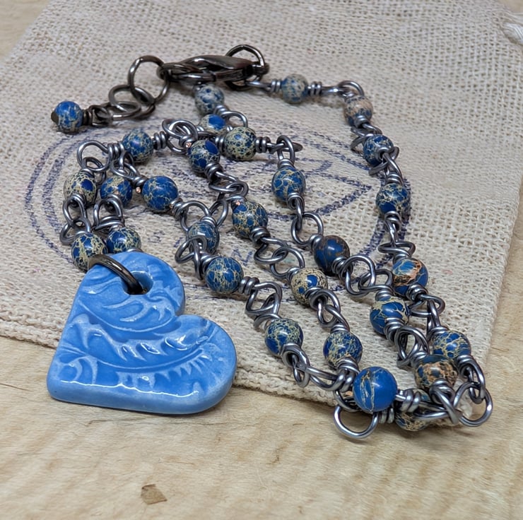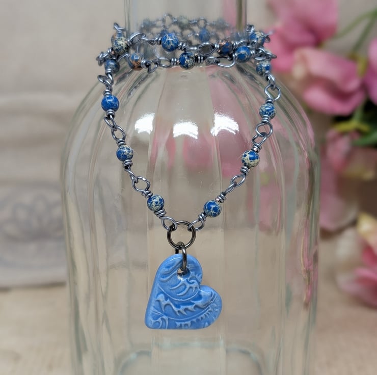 This delicate necklace features a beautiful blue ceramic heart focal pendant. The chain consists of 4mm blue sea sediment jasper beads individually wrapped and made into links with gunmetal grey wire. It has a lobster clasp fastener.