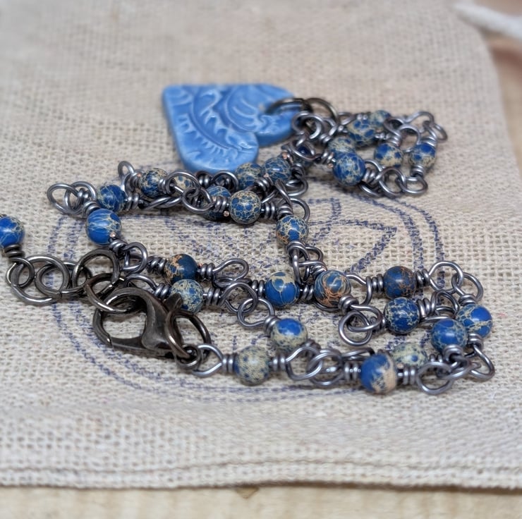 I love the way the blue from the semi precious jasper matches the ceramic heart, which are both complemented by the grey wire. Jasper is often associated with emotional balance so it seems a good choice to pair with the heart pendant.
