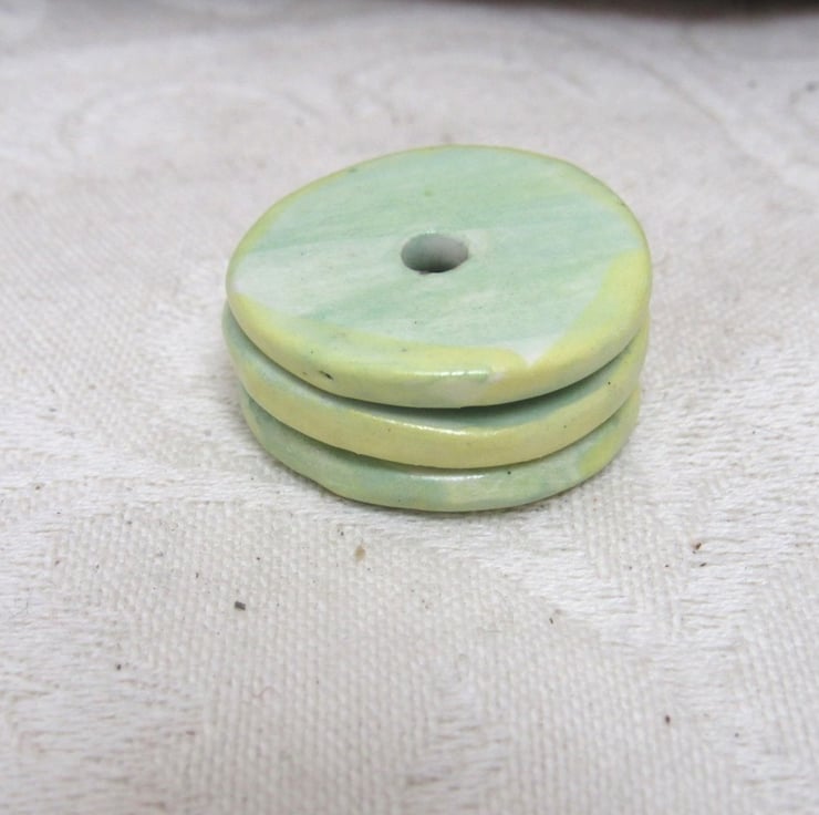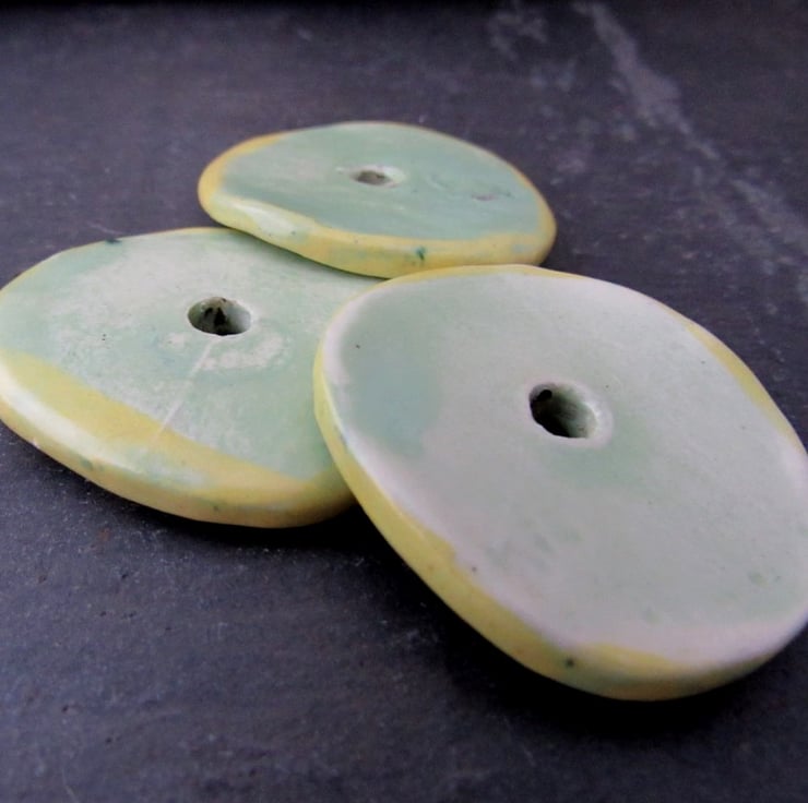3 large hand-cut ceramic beads, coloured with pale green and yellow slips and finished with a clear glaze.