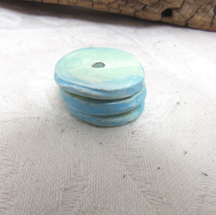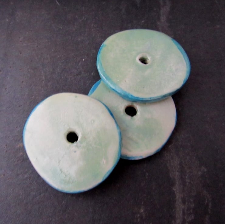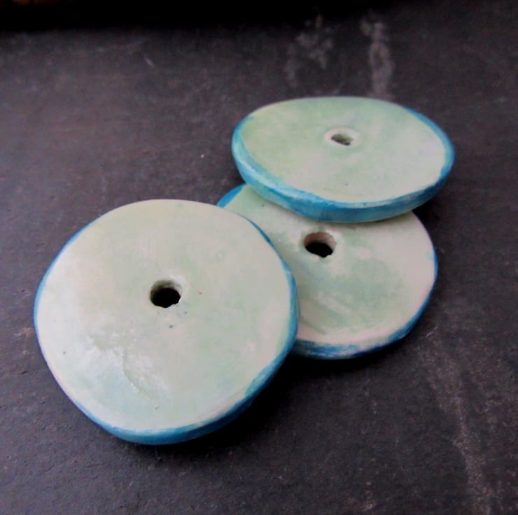 3 large hand-cut ceramic beads, coloured with pale green and bright blue slips and finished with a clear glaze.