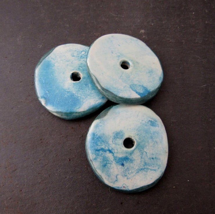 3 large hand-cut ceramic beads, coloured with light blue and dark green slips and finished with a clear glaze.