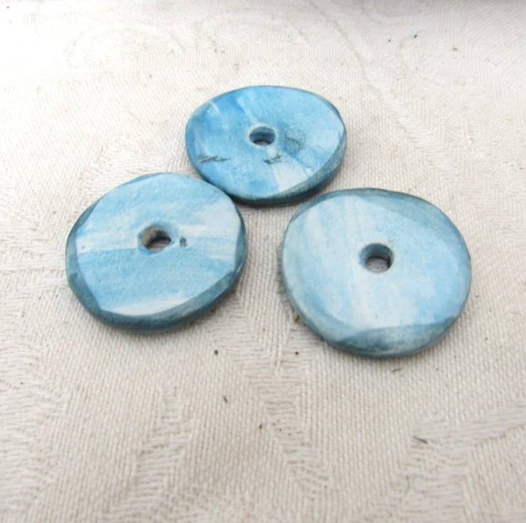 3 Extra-Large Light Blue and Dark Green Glazed Ceramic Disc Beads