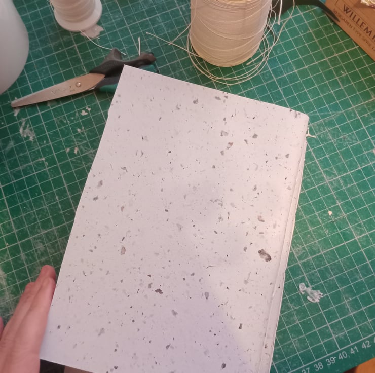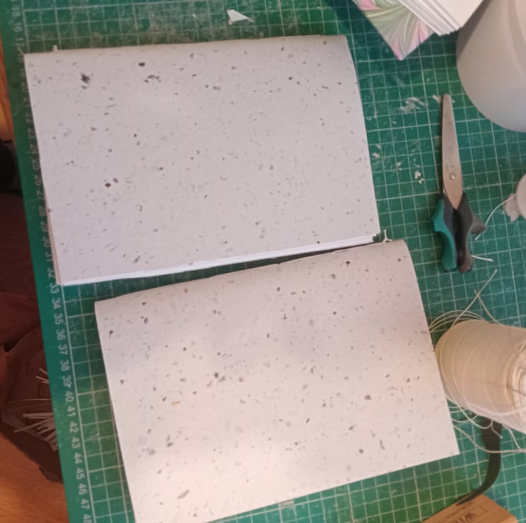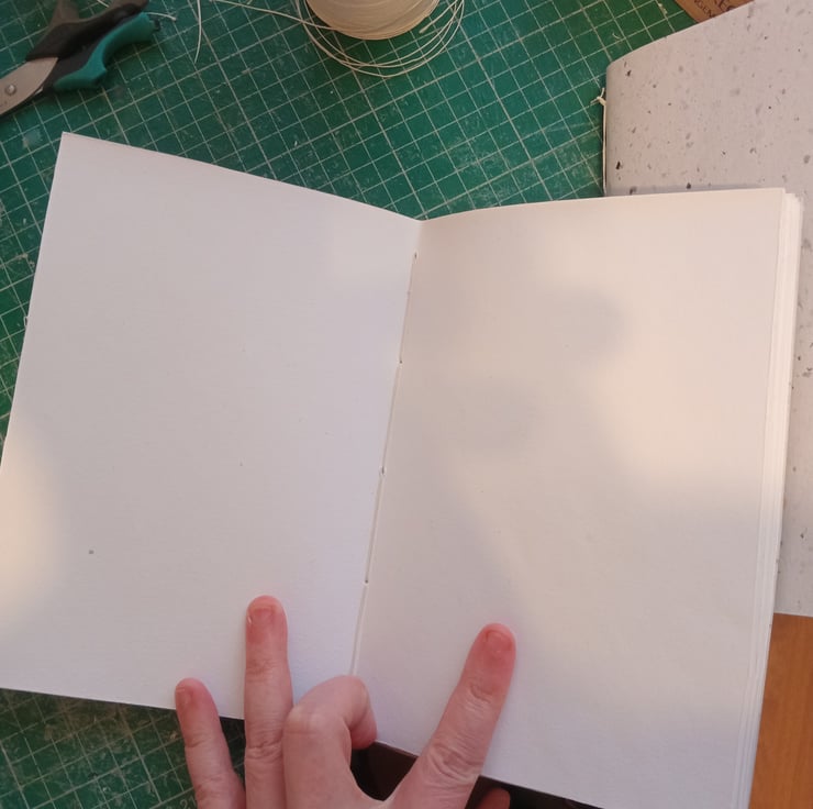 Smooth Indian cotton rag watercolour paper stitched with pamphlet stitch in a decortive cotton paper cover. Note only one has the text on inside cover.