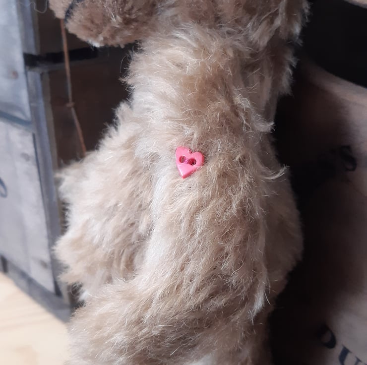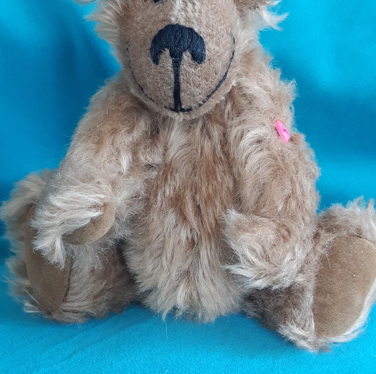 Handmade bear brown distressed mohair. Fully jointed with cotterpin joints. Polyfil filling. Glass bead eyes. Height 15cms sitting, 21cms standing.