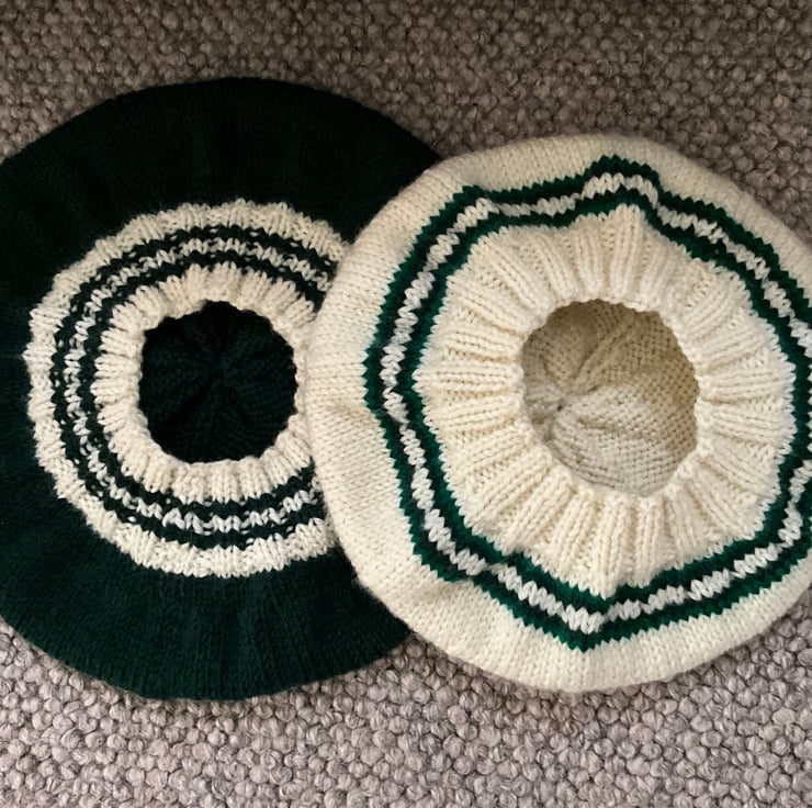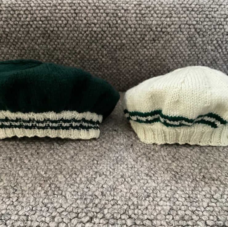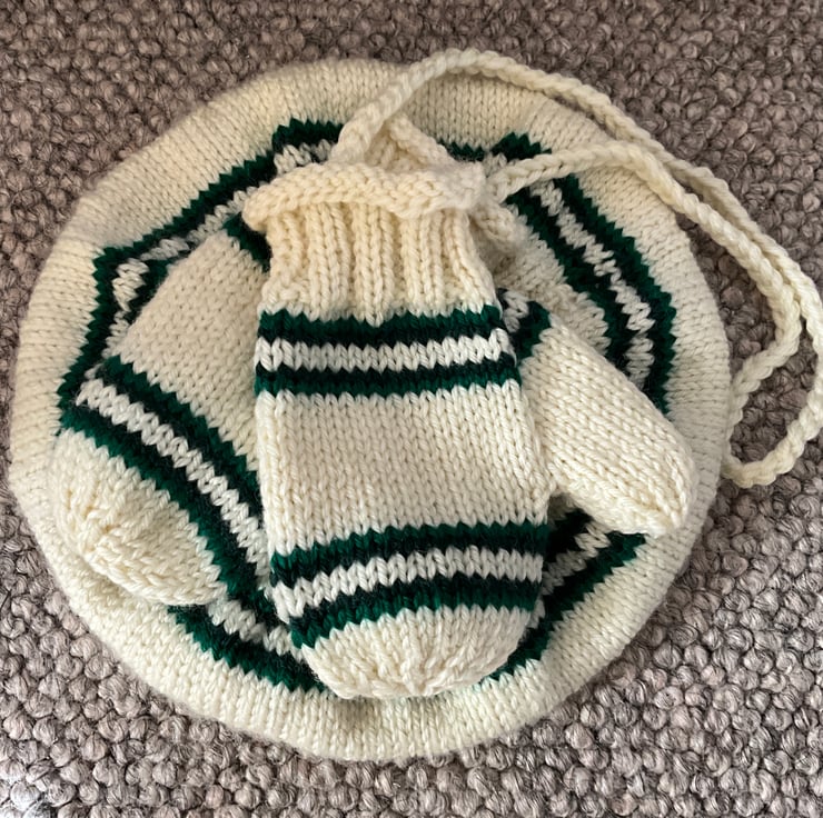 And for the girls if you prefer a beret style hat for your little one. In toddler and child size. In maximum of three colours with stripe or fair isle design . In pure Marino soft warm yarn, which can go in the machine. Beret and lined mittens make up the set.