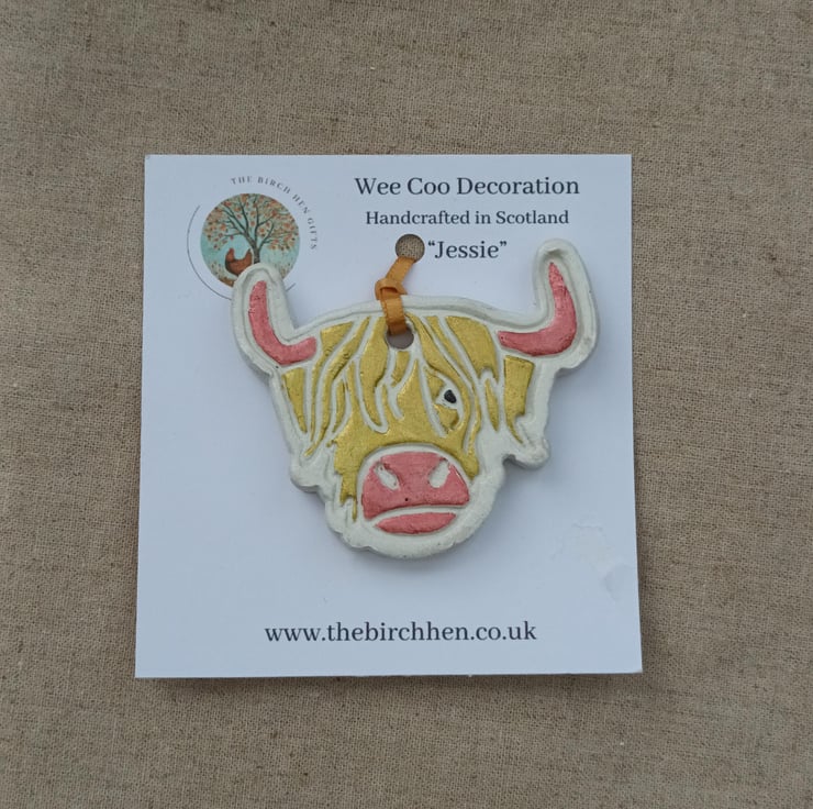 Add some Scottish charm to your home décor with our "Wee Coo" Highland Cow Decoration "Jessie". This adorable ornament has been hand-embossed and hand-painted featuring a fluffy Highland cow design in vibrant colours that will brighten up your home.