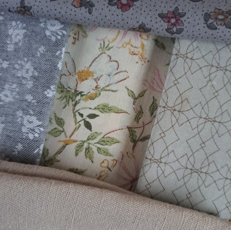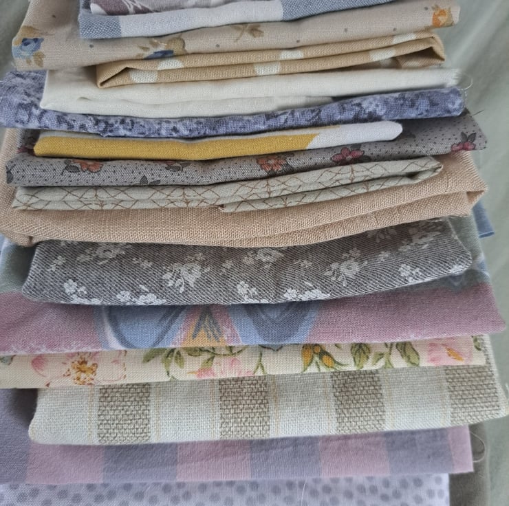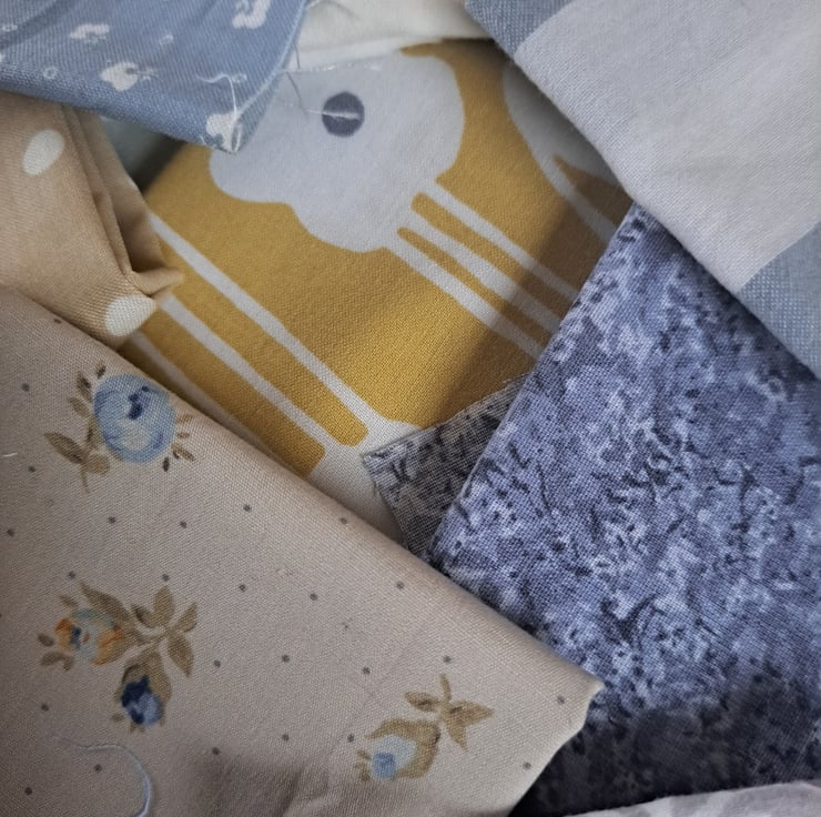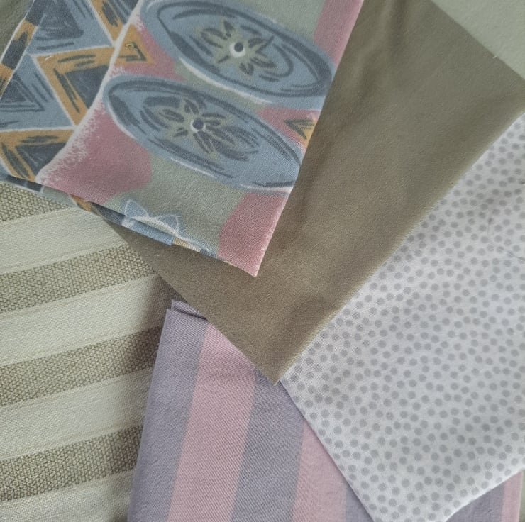 This bundle started out with that nostalgic vintage shirting with its circles and triangles in softs pinks and blues and then the rest just trickled together to form a gentle collection of taupes, greys and beiges. Approximately 20 assorted pieces of repurposed and vintage cotton fabrics (maybe one polycotton - not sure) all coming at you in hushed tones.