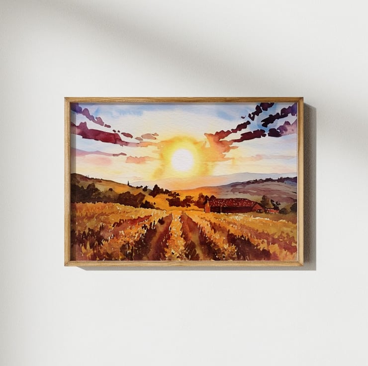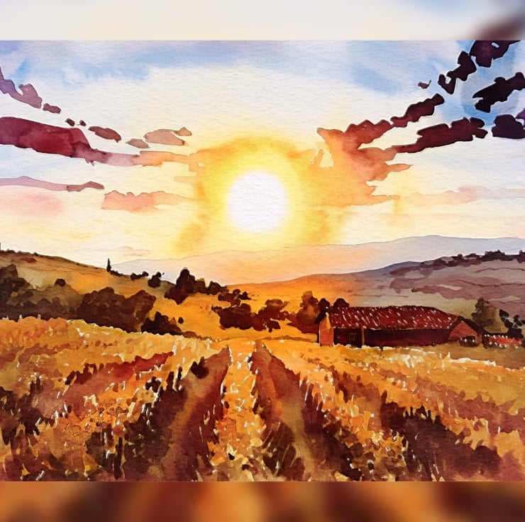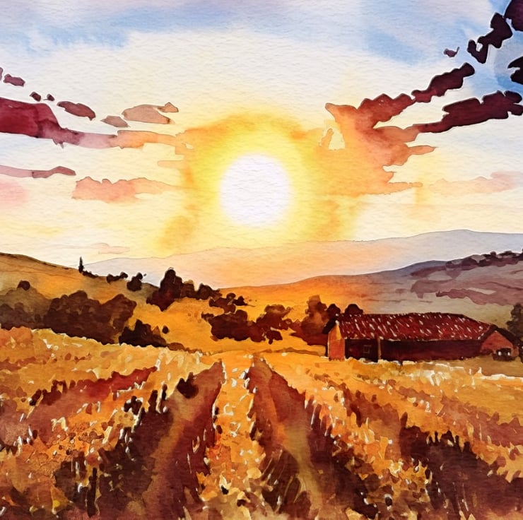 This watercolor painting captures the warmth of a peaceful country evening.