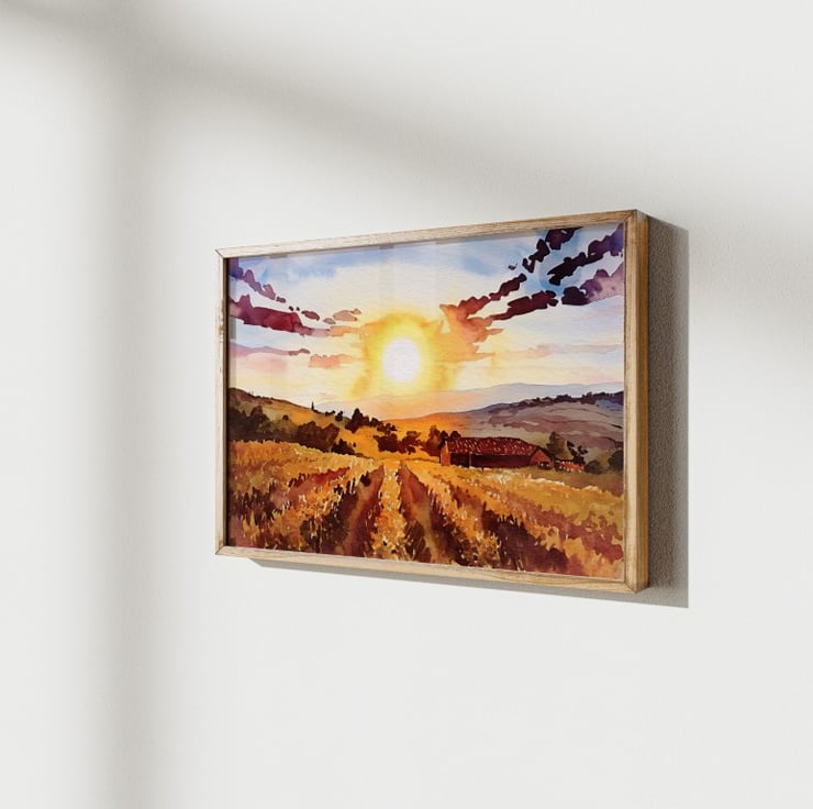 Perfect for anyone who loves country landscapes or breathtaking sunsets, this painting brings a cozy, inviting glow to any space. Whether in a home, office, or cottage, it adds a touch of rural charm and peaceful beauty.