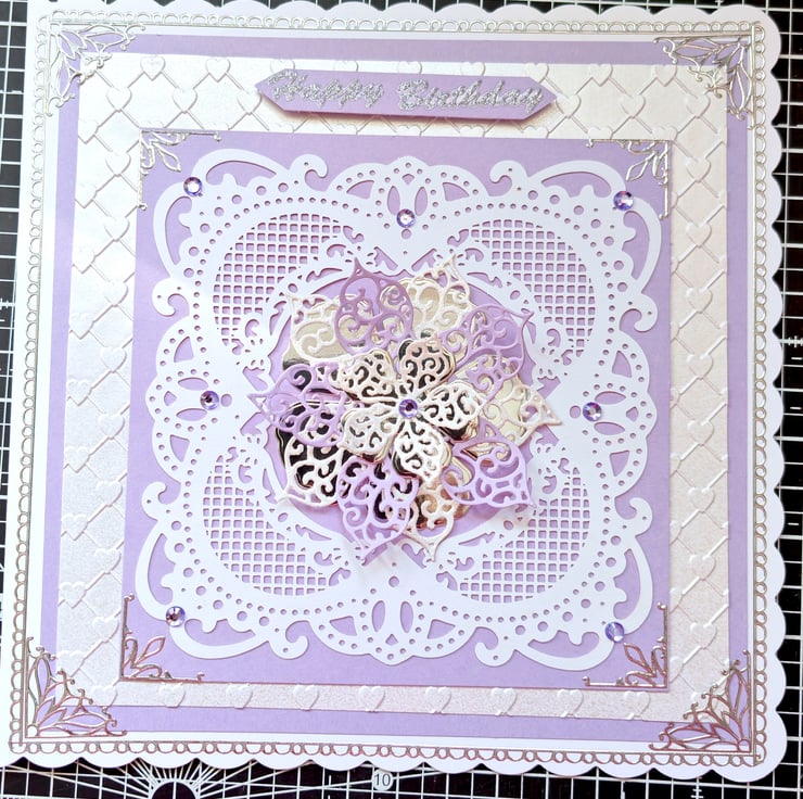 This luxury Birthday card is handmade by me and features lovely embossed heart backing with multiple layered lacy sections building up to a beautiful 3d purple and white flower, with crystals in the corners and the centre if the flower.