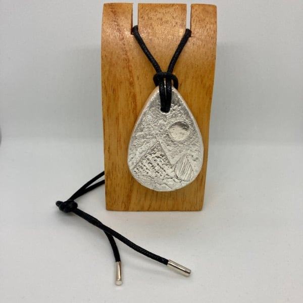 Handmade Silver Pendant with Moonlit Mountain landscape on black cord