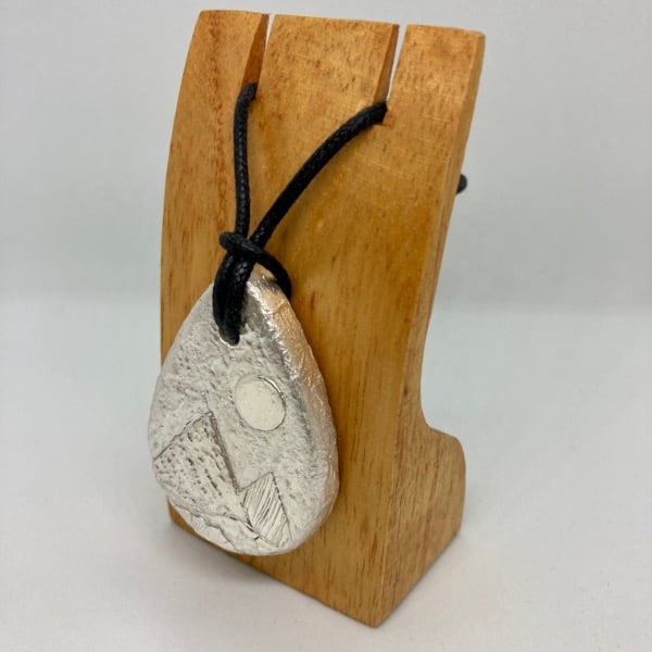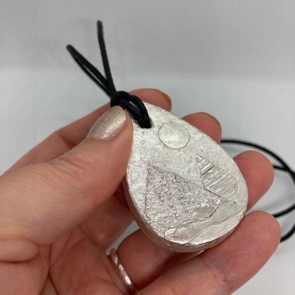 I work with a medium called Silver clay. This uses recycled, ground up particles of silver with an organic binder which can be shaped and textured before being fired.The Moonlit Mountains Pendant began life as a flat ceramic bead. It was then coated with 5 layers of silver clay. Once that dried I could then gradually building up the moonlit landscape you see using thin sheets of hand textured silver. It took about a week to construct, waiting for each layer to dry before I could move onto the next stage. After firing it was hand polished and the cord attached.