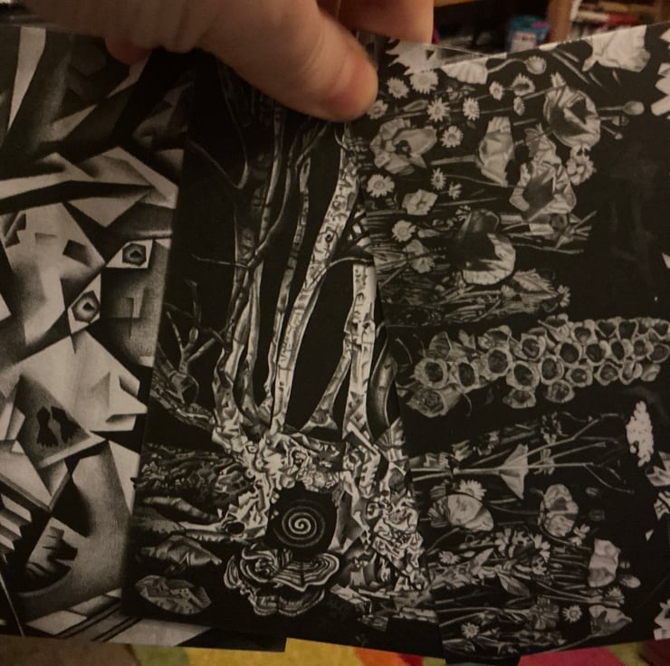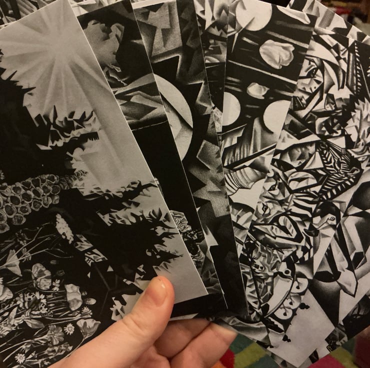 All ten Black and White drawings made into postcards in compostable packaging.