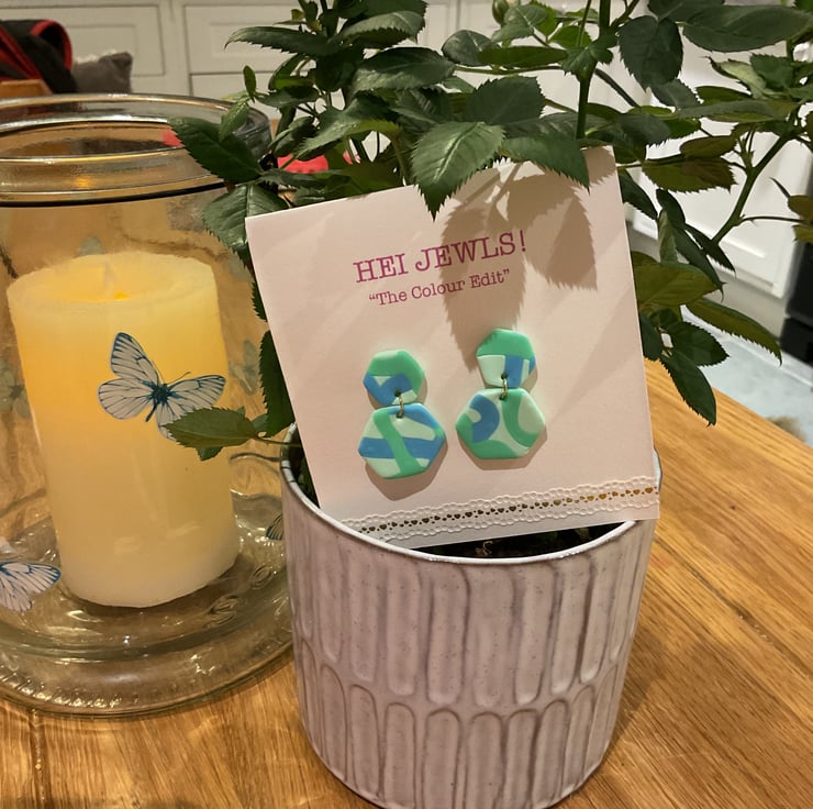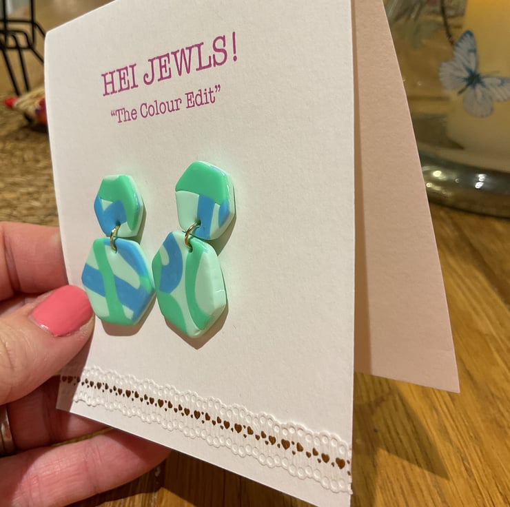 Light green and blue boho earrings. Handmade and designed with love in Sussex by the sea. Gold plated ear posts and butterflies. 3.5 cm total length. Beautifully presented and a perfect gift or treat for yourself.