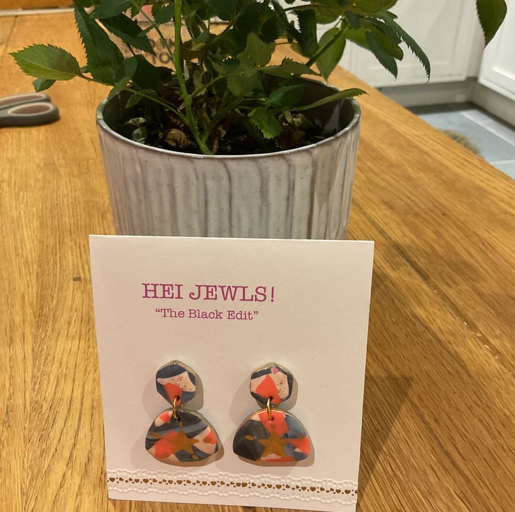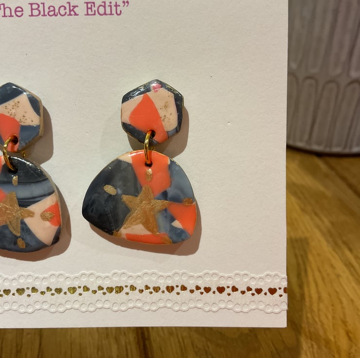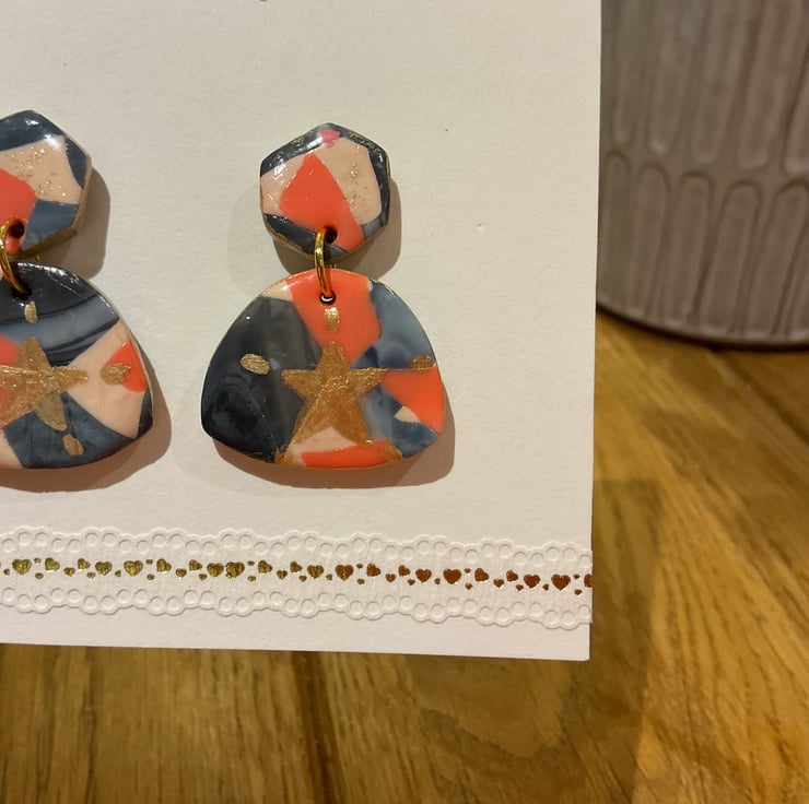 Beautiful handmade and designed dangle earrings. Made in Sussex by the sea. Hand painted and embellished with a gold star. Gold plated ear posts and butterflies. 4cm drop.