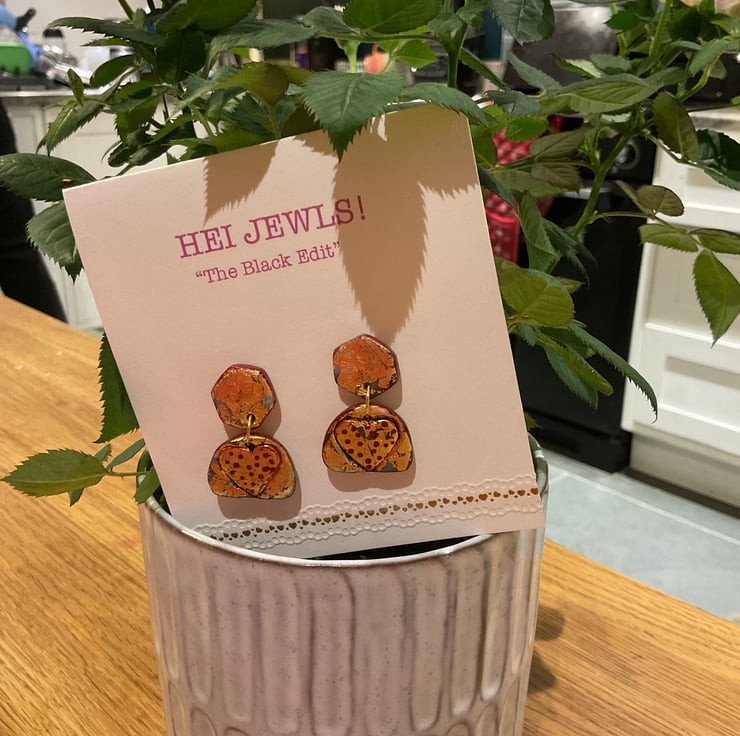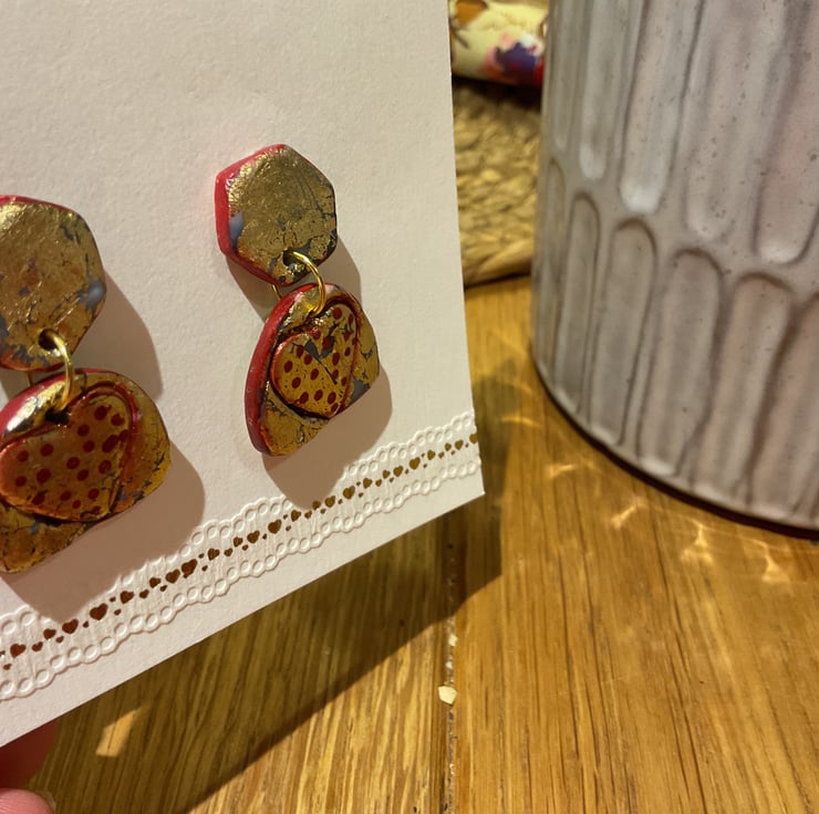 Beautiful handmade and designed dangle earrings. Made in Sussex by the sea. Hearts embossed in golden flakes and hand painted . Gold plated ear posts and butterflies. 3.5 cm drop.