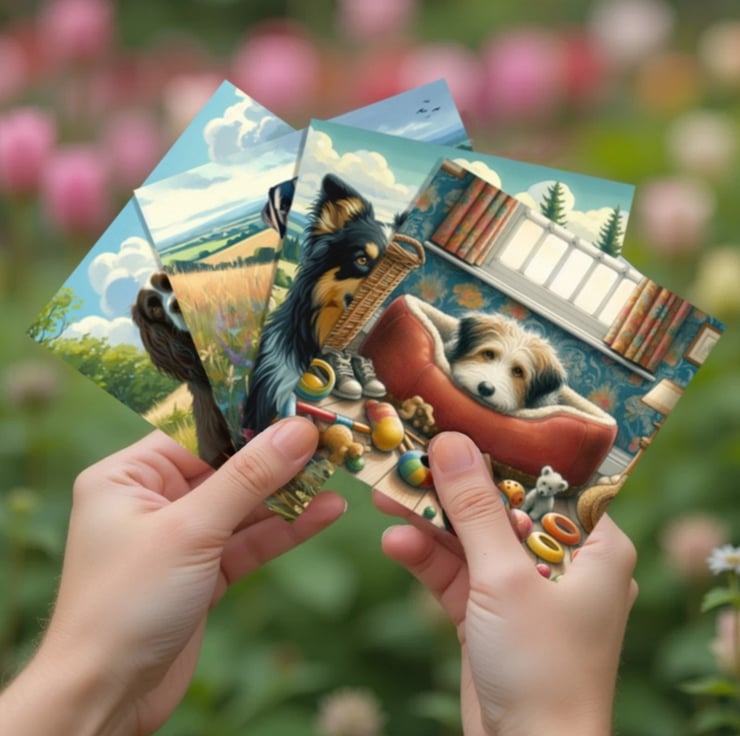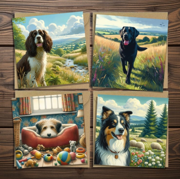 A collection of four 148mm square cards depicting different breeds of dog in action. Perfect for dog loving friends and family members. Each card has been professionally printed on FSC registered cardstock. Cards come with complementary kraft envelopes.