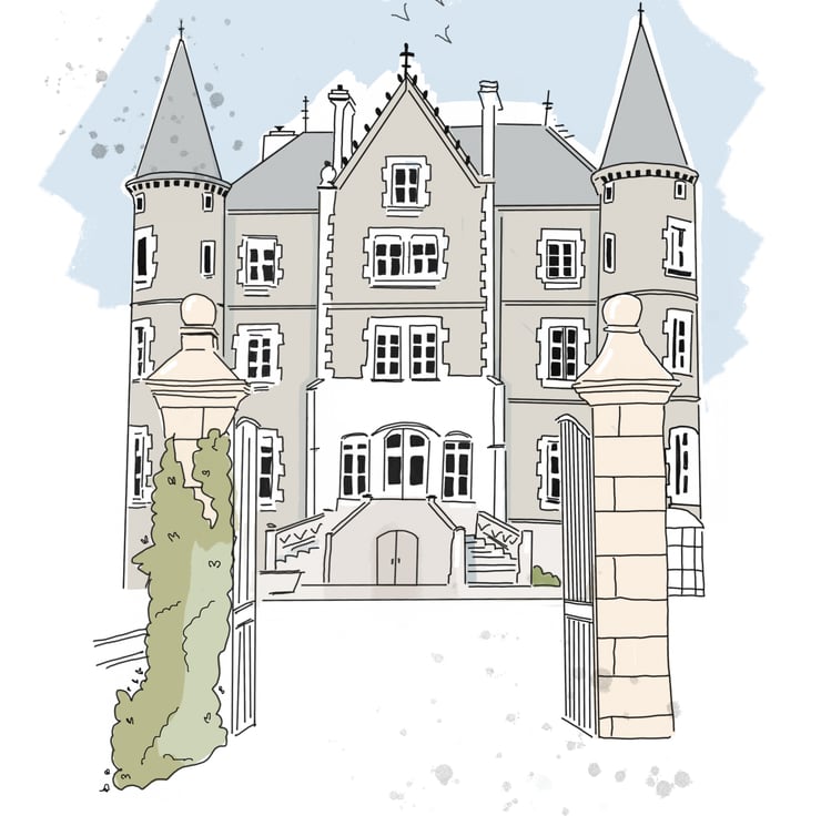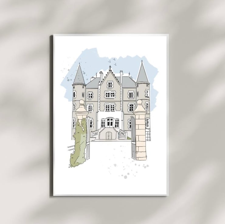 Escape to the chateau print of my original drawing in A4 Size printed on to quality stock card. I have two designs of this print one with the Strawbridge family in front of the chateau and one design with just the beautiful Chateau.
