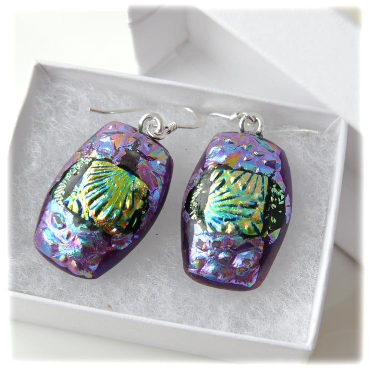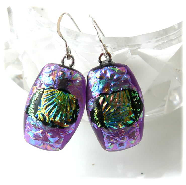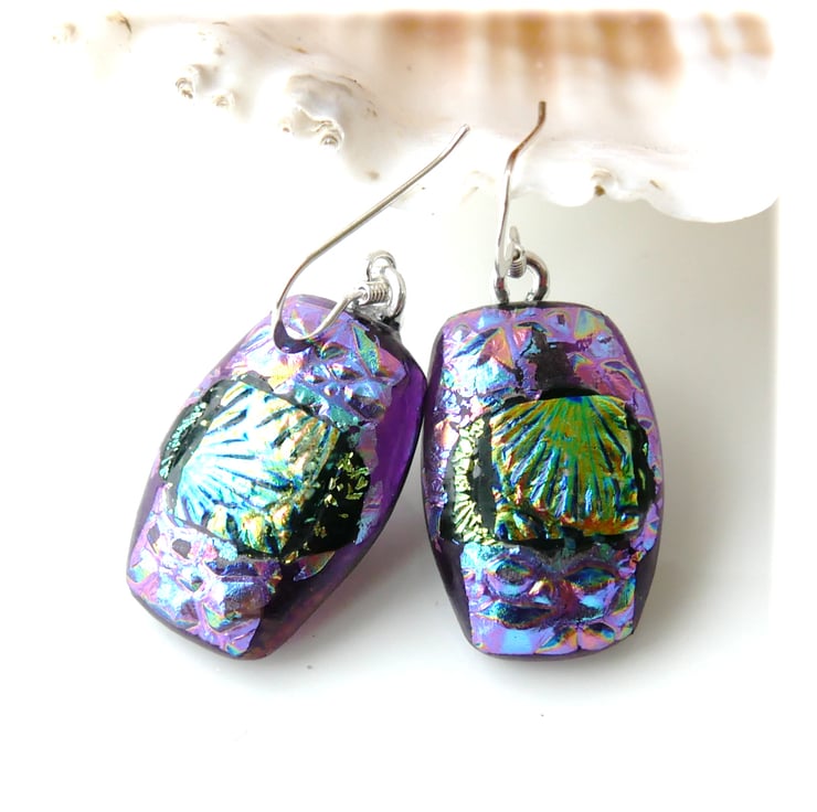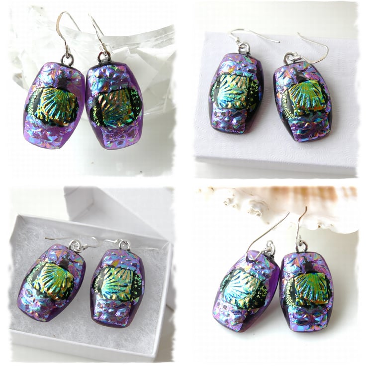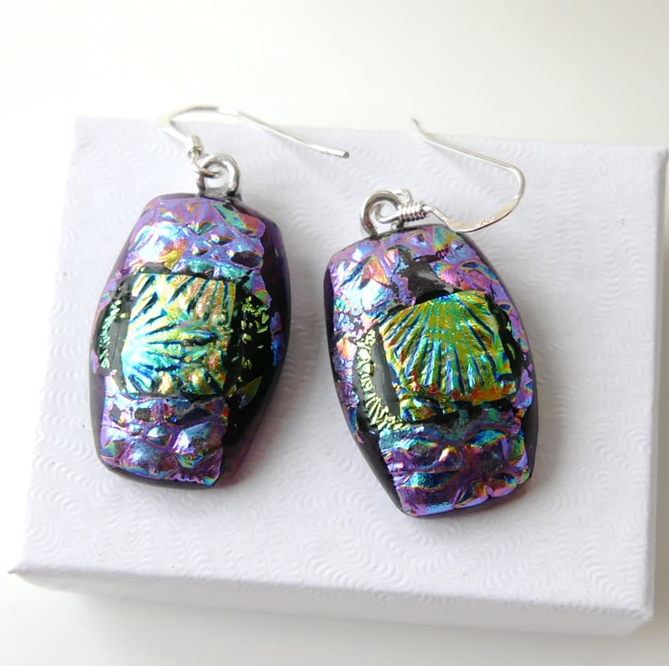 I've taken several photos of the earrings to try to show you the colour which changes in the light. this is a feature of wonderful dichroic glass.