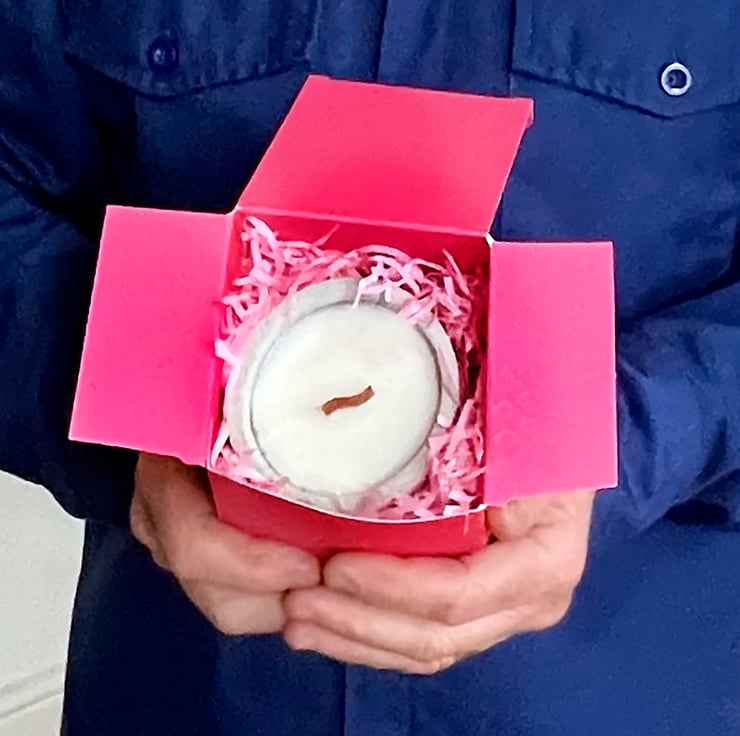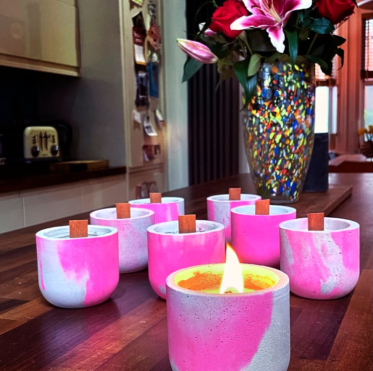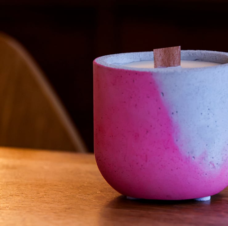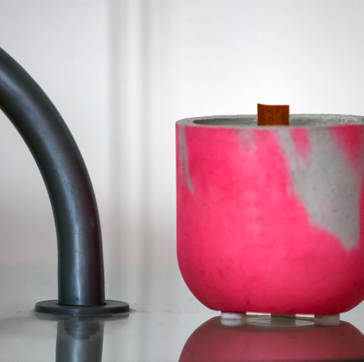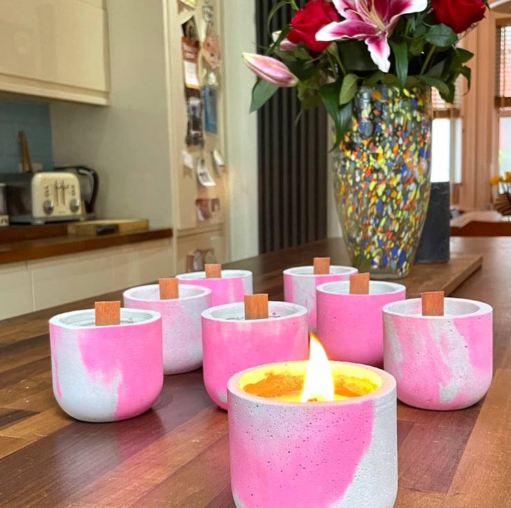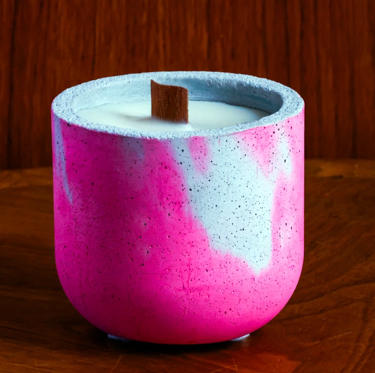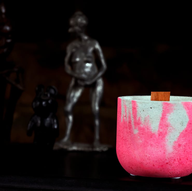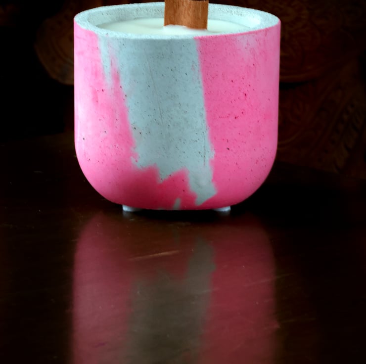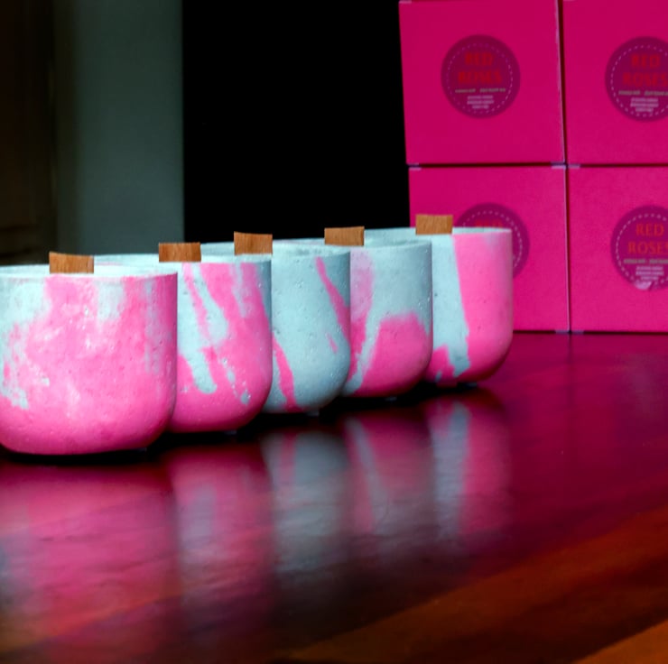 grey and pink concrete cast candle holder with red roses scented soy wax, each candle holder has been individually cast and it is unique and different to the rest. Due to the casting process the candles may have small imperfections, The was is soy and it is eco plant based. The dimension are 8.5 cm diameter by 8 cm high. The wick is wood and the burning time is 0ver 24 hours. they come packed in a pink box with pink packaging As always do not leave the candles unatended and do not burn them for longer than three hours.