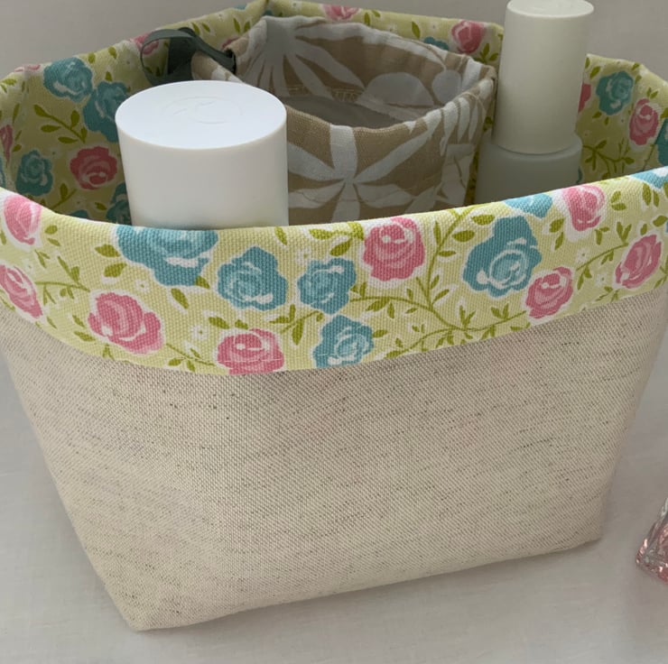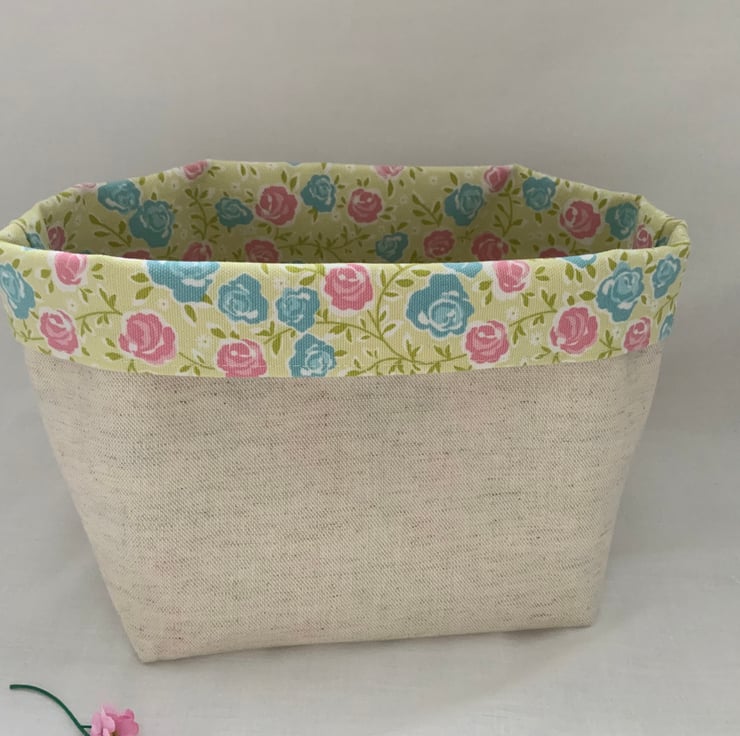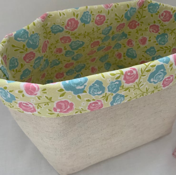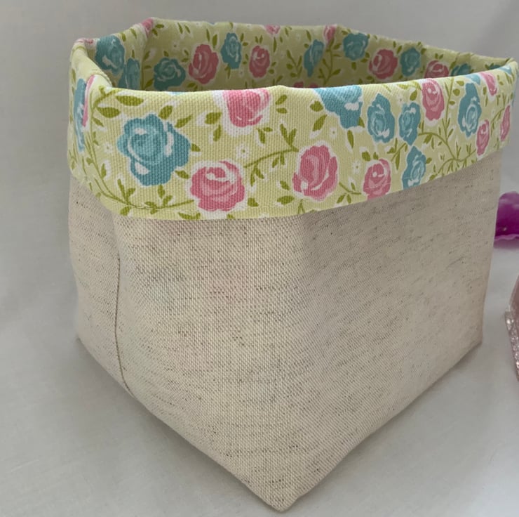 Pretty linen fabric storage box. A great storage box which can be used anywhere in the house and is perfect for keeping bits and bobs tidy. Useful for a craft room, desk tidy, dressing table storage. Made from natural linen and 100% cotton. Prefer a floral exterior? This basket is also fully reversible.