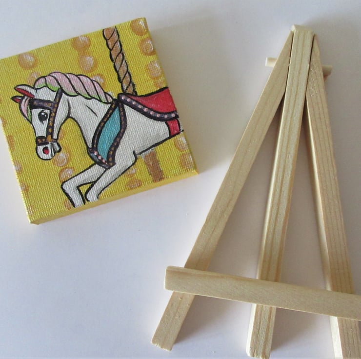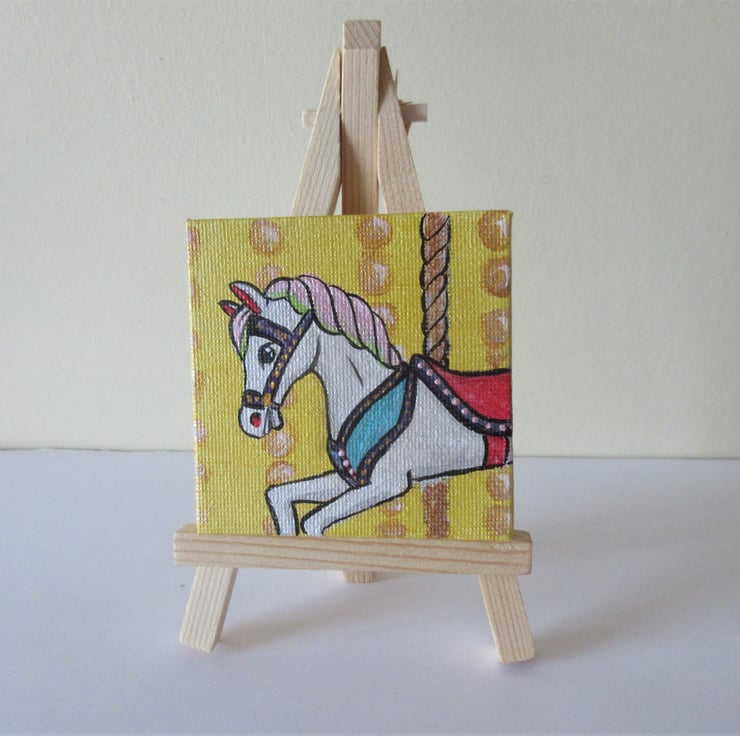 An original painting of a carousel horse, painted on a mini block canvas, complete with wooden mini easel for display.