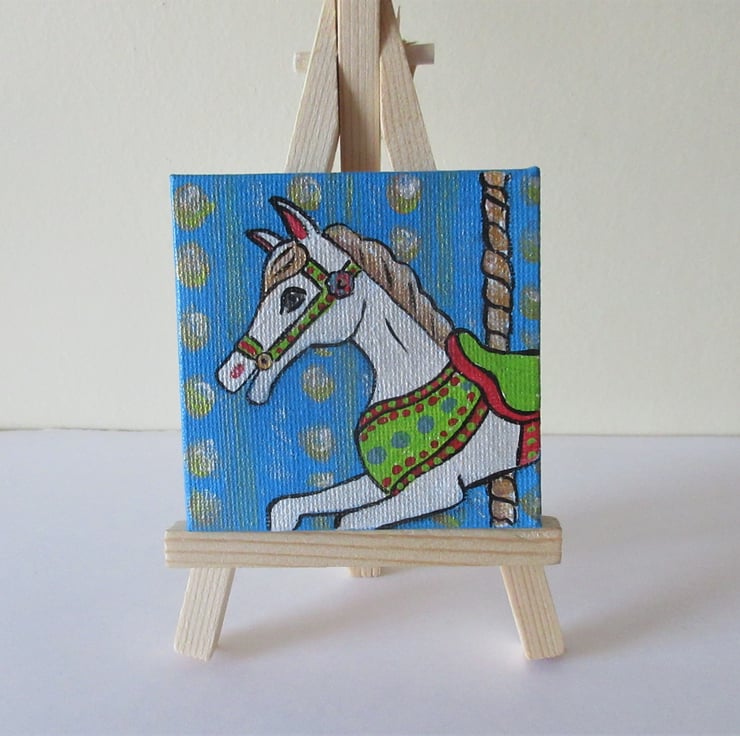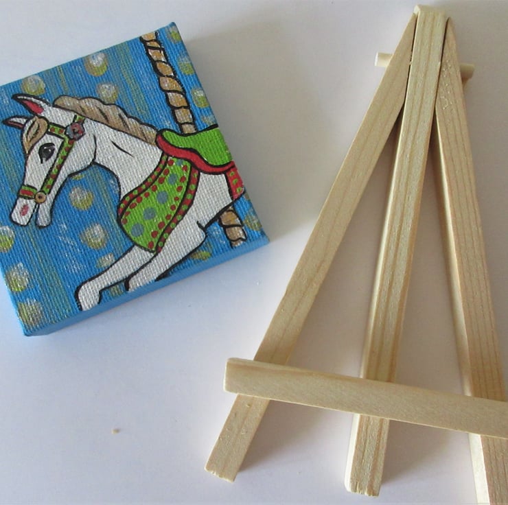 An original painting of a carousel horse, painted on a mini block canvas, complete with wooden mini easel for display.