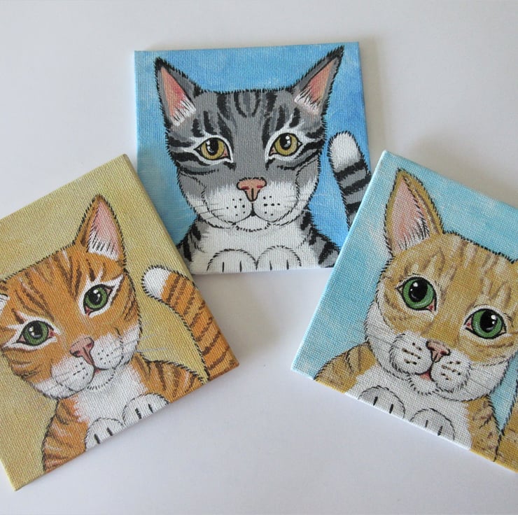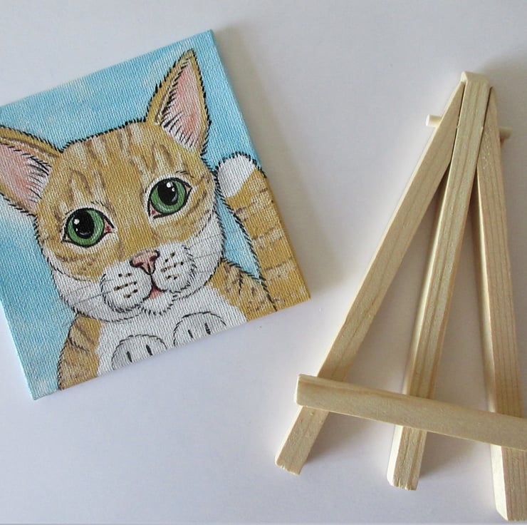 An original painting of a cat, painted on a mini canvas, complete with wooden mini easel for display.