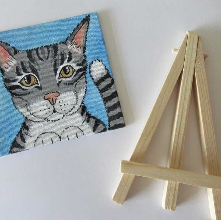 An original painting of a cat, painted on a mini canvas, complete with wooden mini easel for display.