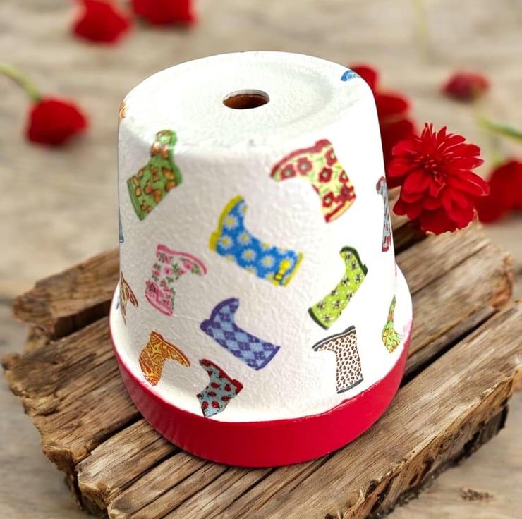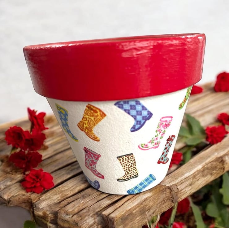 The image has been applied to a terracotta pot after being painted with Annie Sloan chalk paint using the art of Decoupage and finished a water resistant varnish.