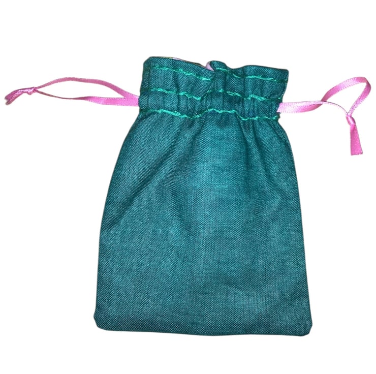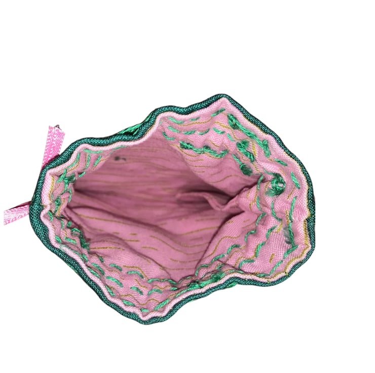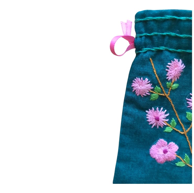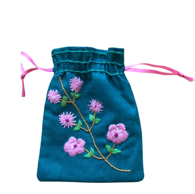 This is a small teal fabric drawstring gift bag with a hand embroidered cherry blossom design on the front. It measures 12 cms long by 10 cms wide. It is fully lined with pretty pink lining.