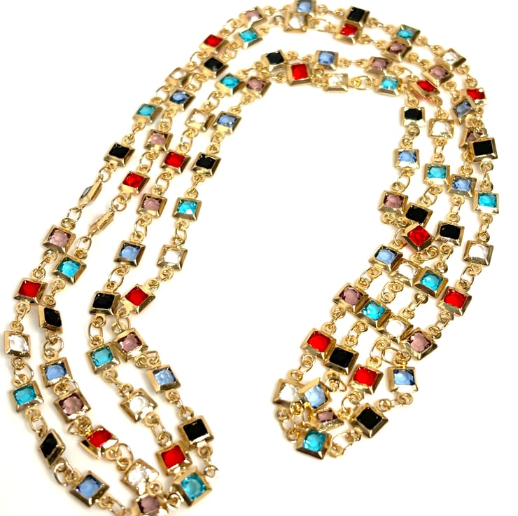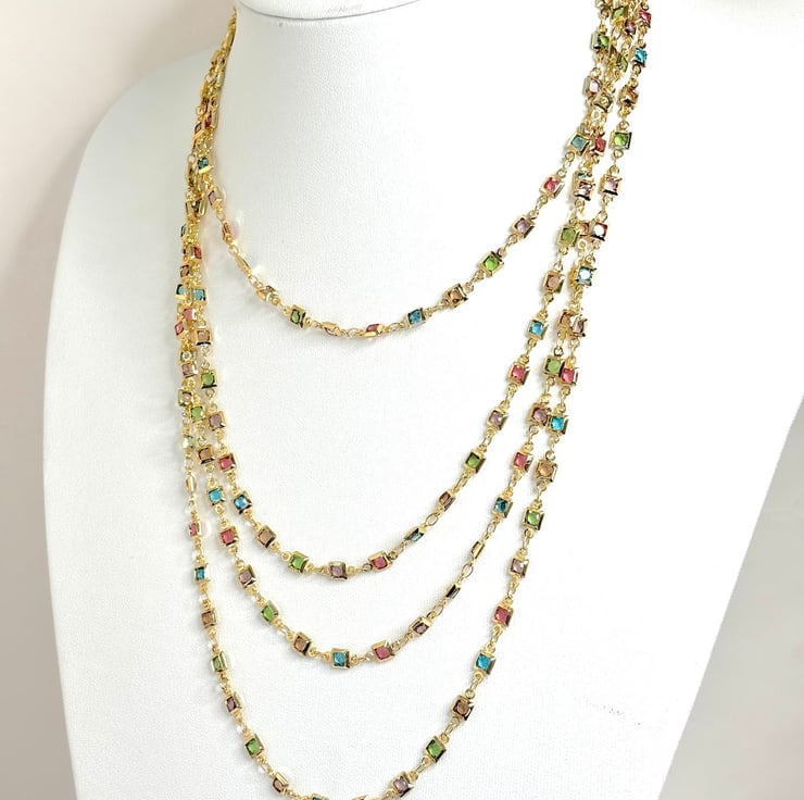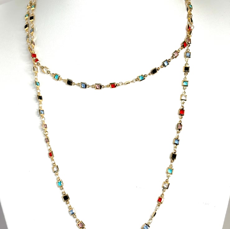 Beautiful very long square multicolour CZ crystal chain, gold tone, 40 inch or 78 inch (main picture shows 78 inch)