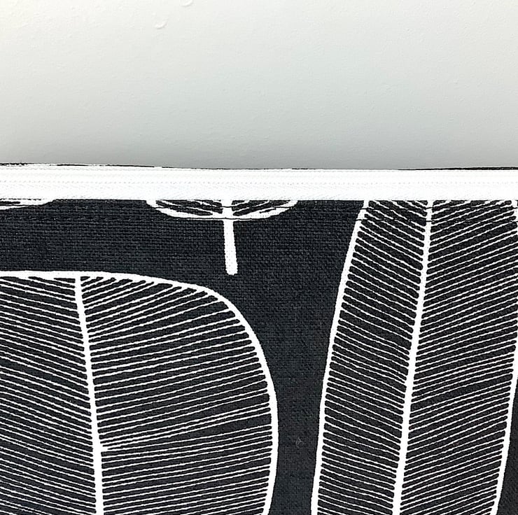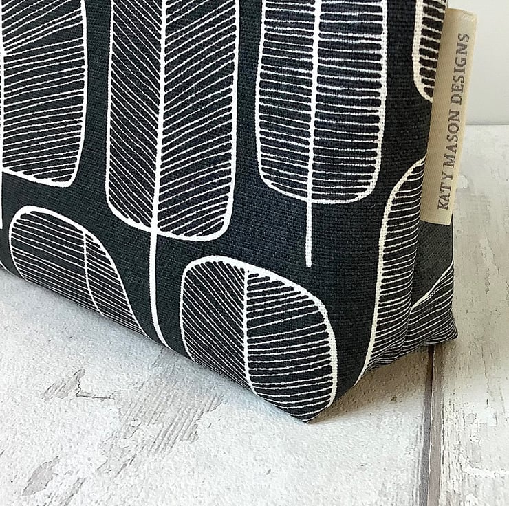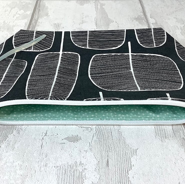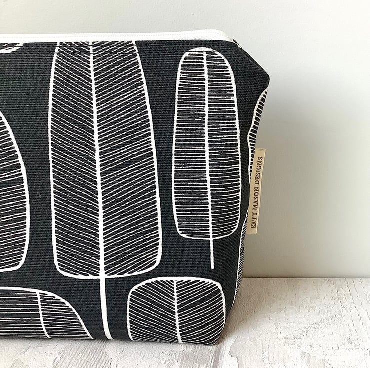 Black and white tree print cosmetic bag with blue spot lining. 24cm wide, 19cm high, 6cm deep. Perfect for make up or accessories. Matching items available with this item.