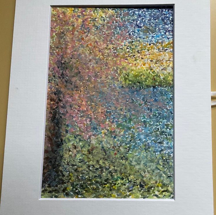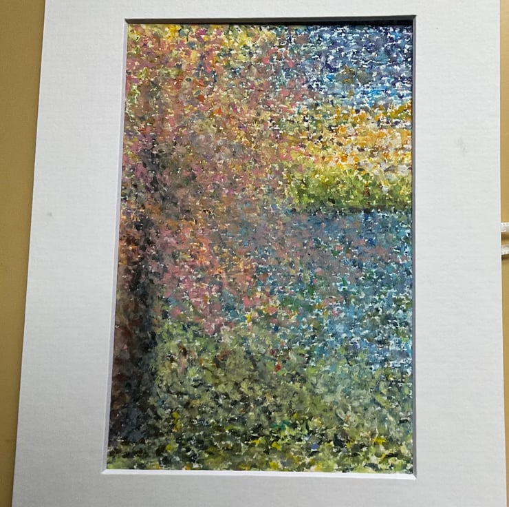 An original impressionist pointillism handmade painting made on quality paper and Senellier oil pastels. The painting is mounted and ready to frame. The painting can be used as a special greeting card which can be personalised by you with the text of you4 choice written in the book inside. The mat has a ribbon which helps present it as a gift with a surprise inside. An original long lasting card a gift all in one.
